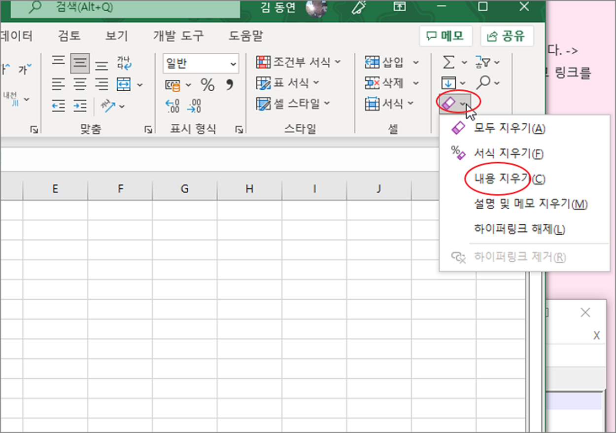 ▼ 또는 리본 메뉴에서 지우는 방법도 있습니다. 홈 탭 > 지우개 > 내용 지우기 메뉴를 선택해서 셀 데이터를 지우기도 합니다.