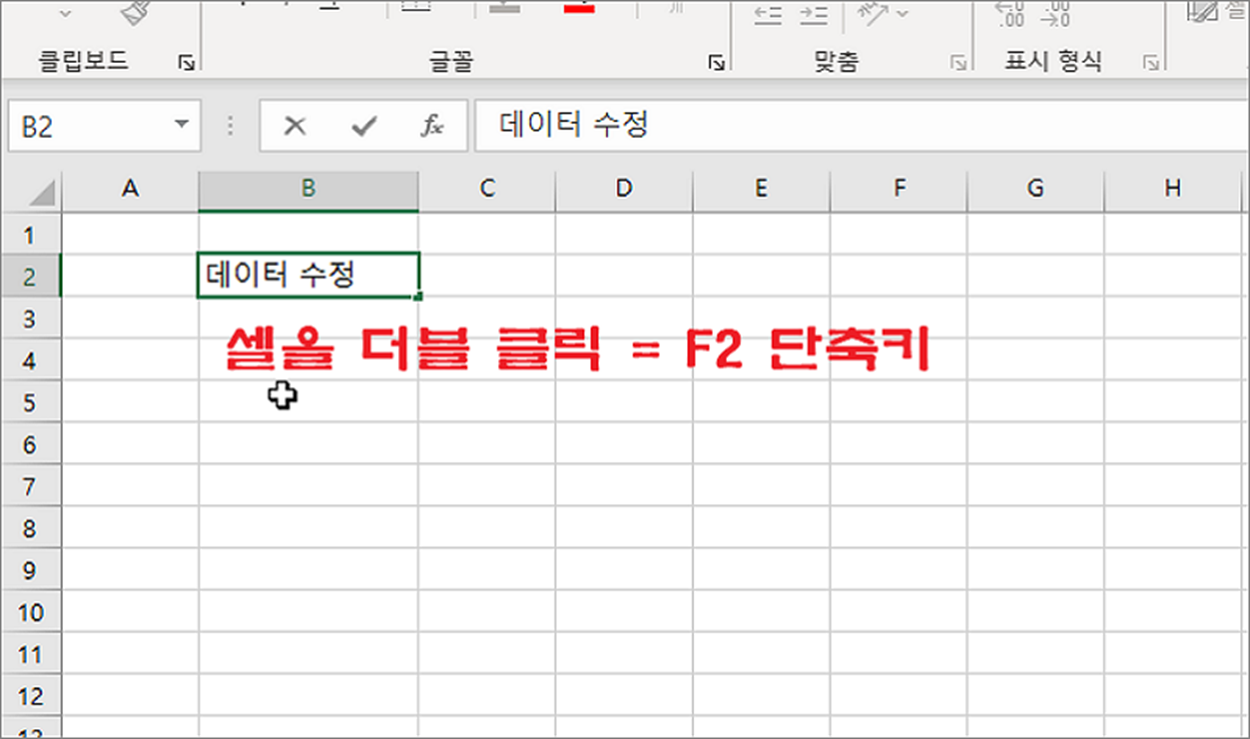 ▼ 다음은 기존의 셀에 있던 데이터를 수정하는 방법입니다. 수정할 데이터가 있는 셀을 선택합니다. 그리고 F2 단축키를 누르면 셀이 편집 상태로 바뀌고 텍스트 제일 끝에 커서가 위치합니다.