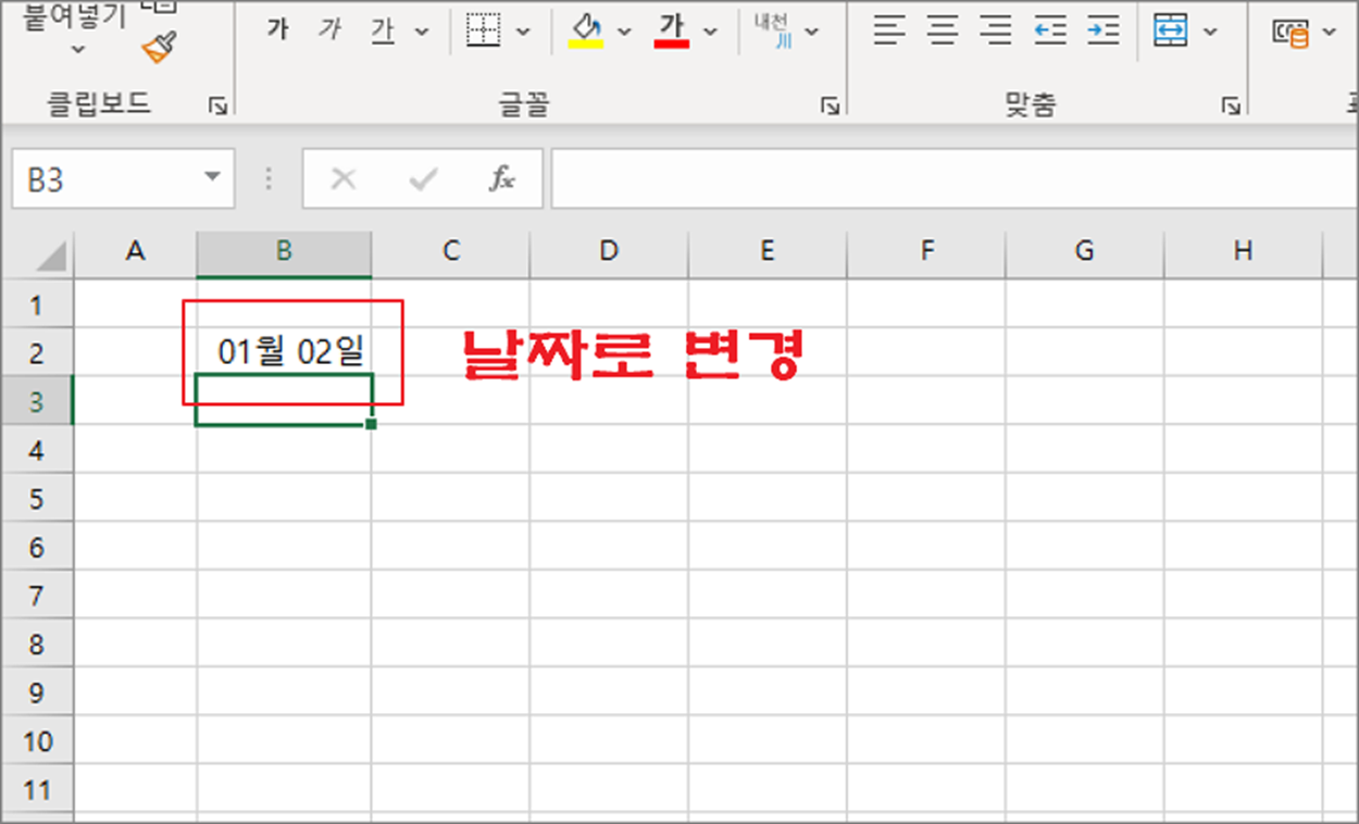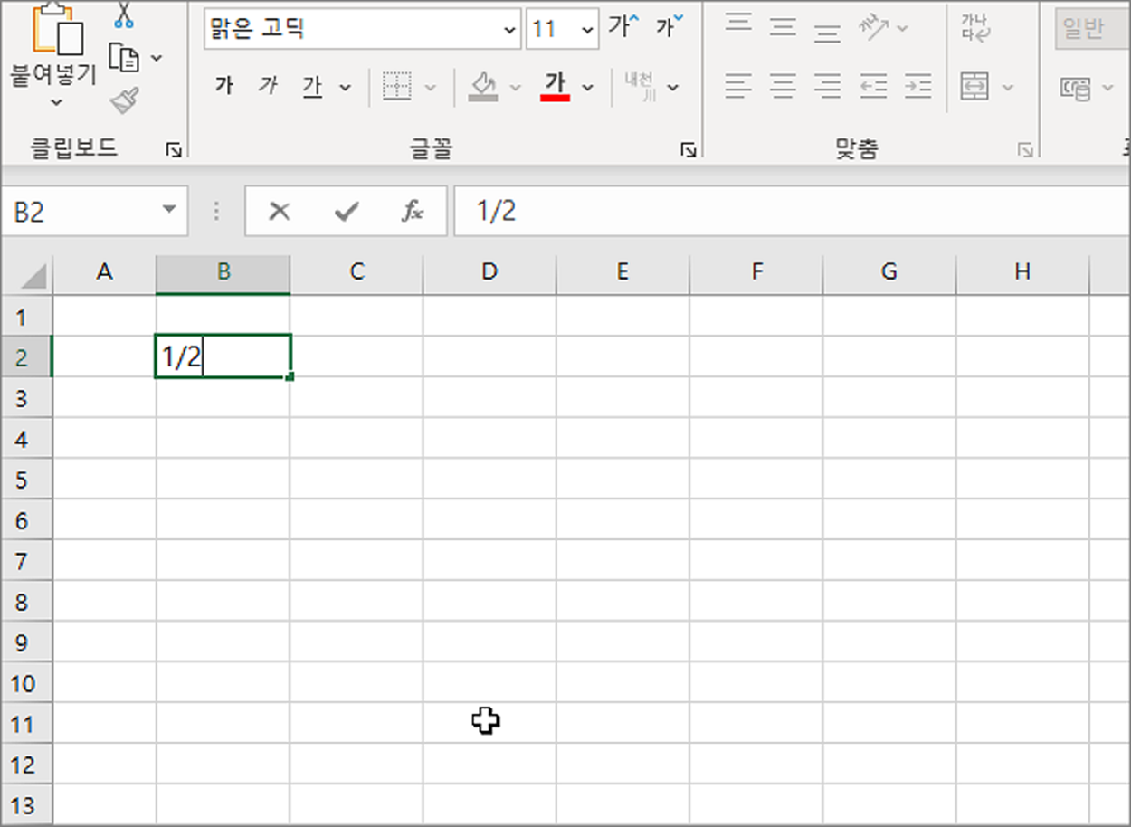▼ 결과는 아래와 같습니다. 엑셀은 1/2 를 날짜로 인식합니다. 그러니까 1월 2일이 되는 것이죠.