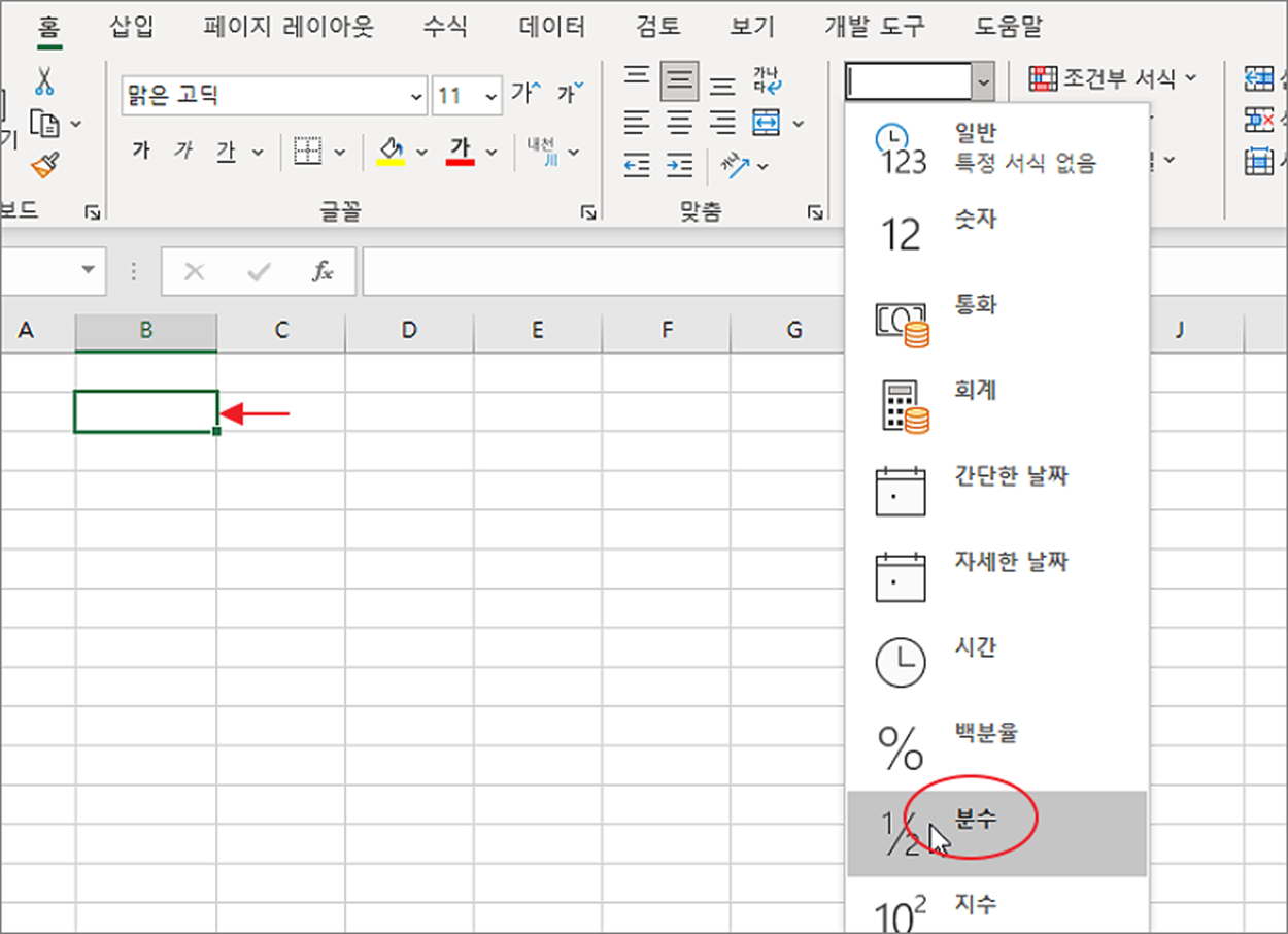 ▼ 사용자가 입력한 분수를 유지하는 첫 번째 방법은 셀 표시 형식을 분수로 지정하는 것입니다. 셀을 선택하고 홈 탭 > 표시 형식 > 분수로 변경합니다.