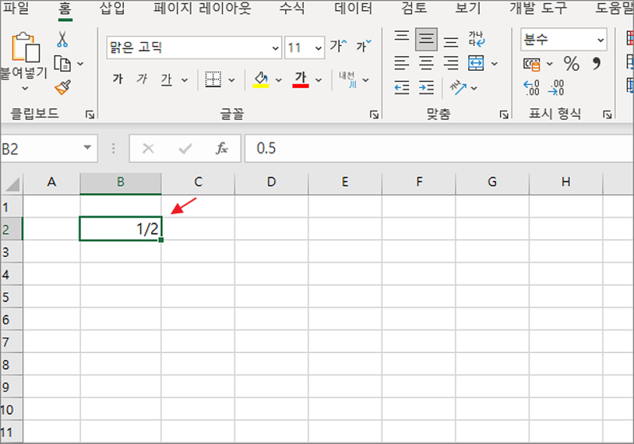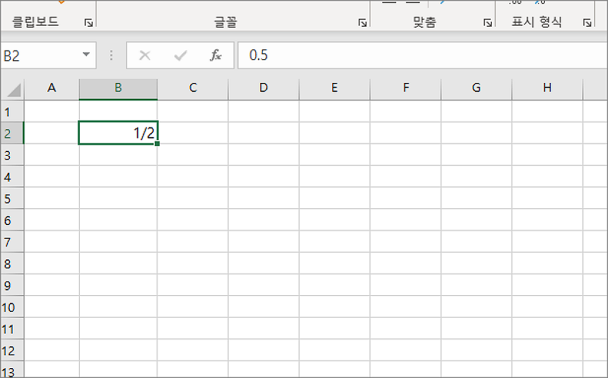 ▼ 셀의 형식이 “일반” 인 곳에 분수를 입력해 보겠습니다. 그림처럼 1/2 를 입력하면 형태를 그대로 유지될까요?
