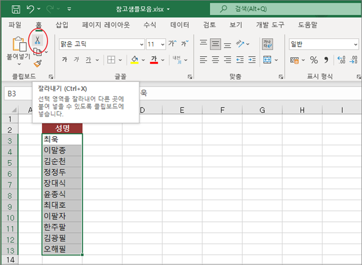 ▼ 잘라내기는 삭제와 다릅니다. 잘라내기는 데이터 삭제와 함께 클립보드에 데이터를 복사합니다. 그래서 목적지에 Ctrl + X 를 눌러 붙여넣기 하면 잘라낸 데이터를 추가하는 것입니다. 데이터 영역을 선택하고 홈 탭 > 잘라내기 메뉴를 클릭합니다.