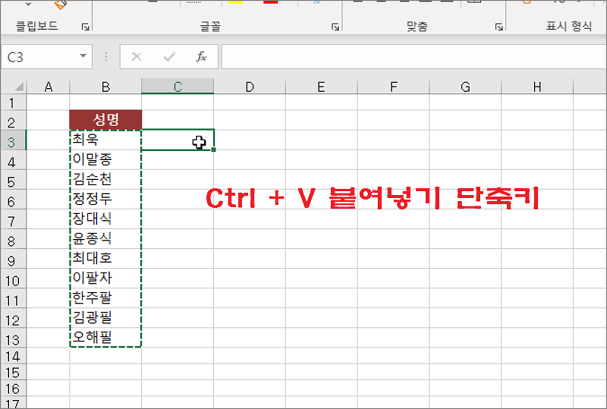 ▼ 세 번째는 단축키를 이용한 방법입니다. Ctrl + V 를 눌러 복사하거나 잘라낸 데이터를 원하는 위치에 붙여 넣습니다.