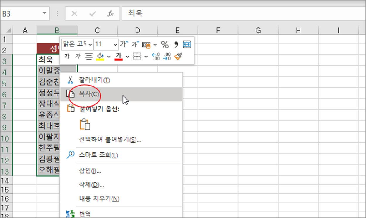 ▼ 두 번째는 영역을 선택하고 오른쪽 마우스를 눌러 복사 메뉴를 선택하는 방법입니다.