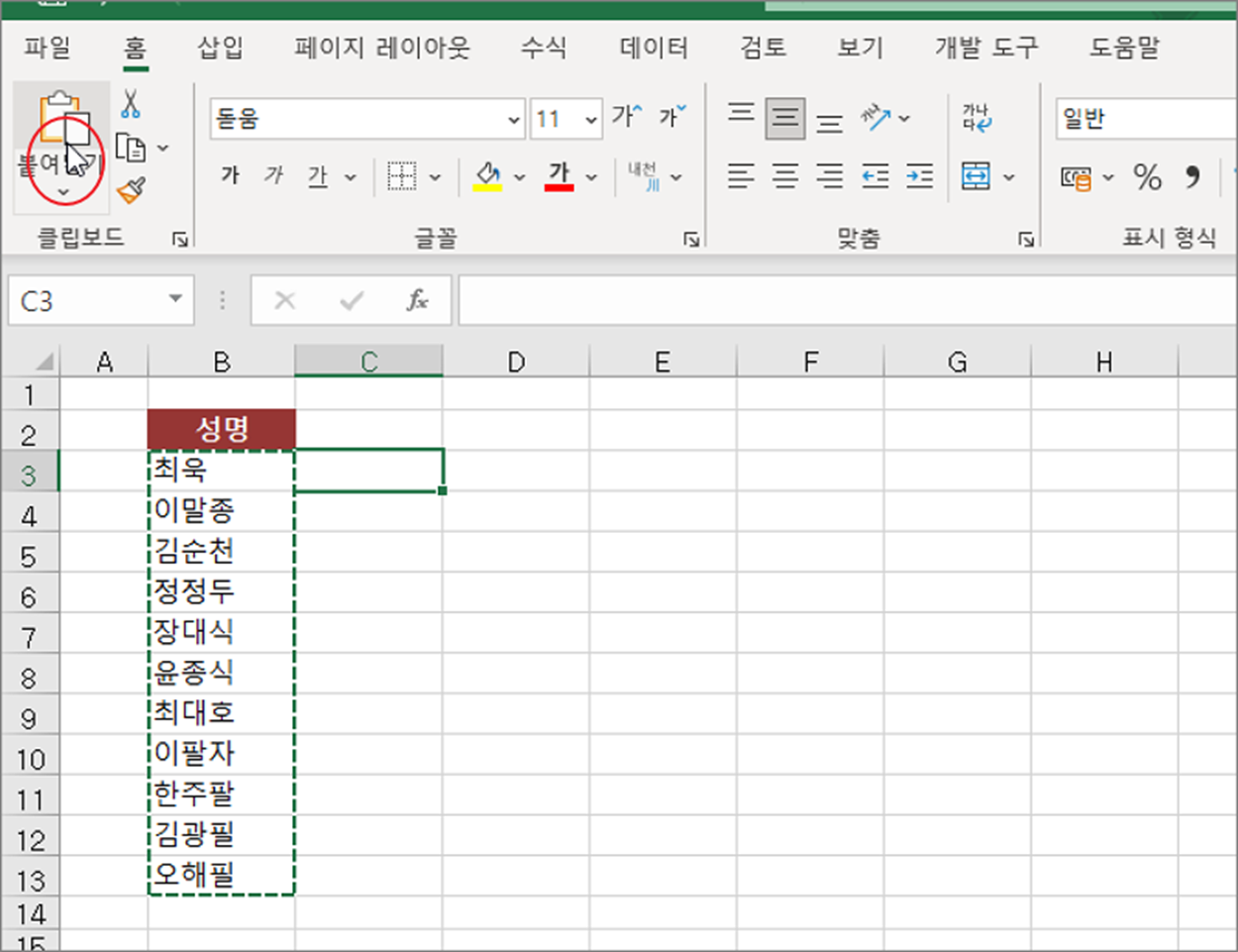 ▼ “붙여넣기” 는 클립보드로 복사하거나 잘라낸 데이터를 셀에 추가하기 위해서 실행하는 명령입니다. 붙여넣기 메뉴는 복사하거나 잘라낸 데이터가 있을 경우 활성화됩니다. 홈 탭 > 클립보드 그룹 > 붙여넣기 메뉴를 클릭합니다.