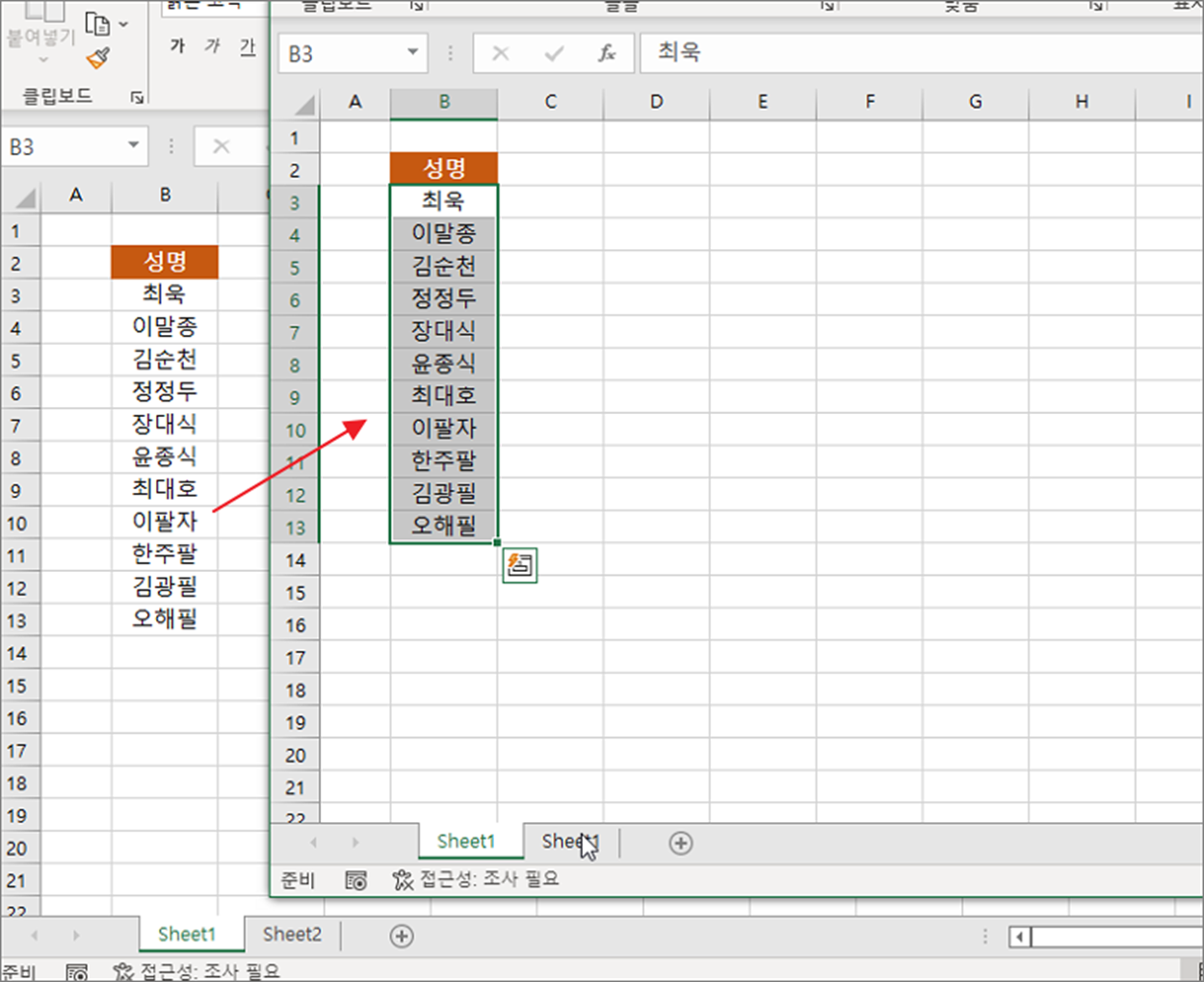 ▼ 확인 버튼을 눌러 이동/복사 창을 닫으면 그림처럼 대상 통합문서 시트에 동일한 데이터가 들어가 있는 것을 확인할 수 있습니다.