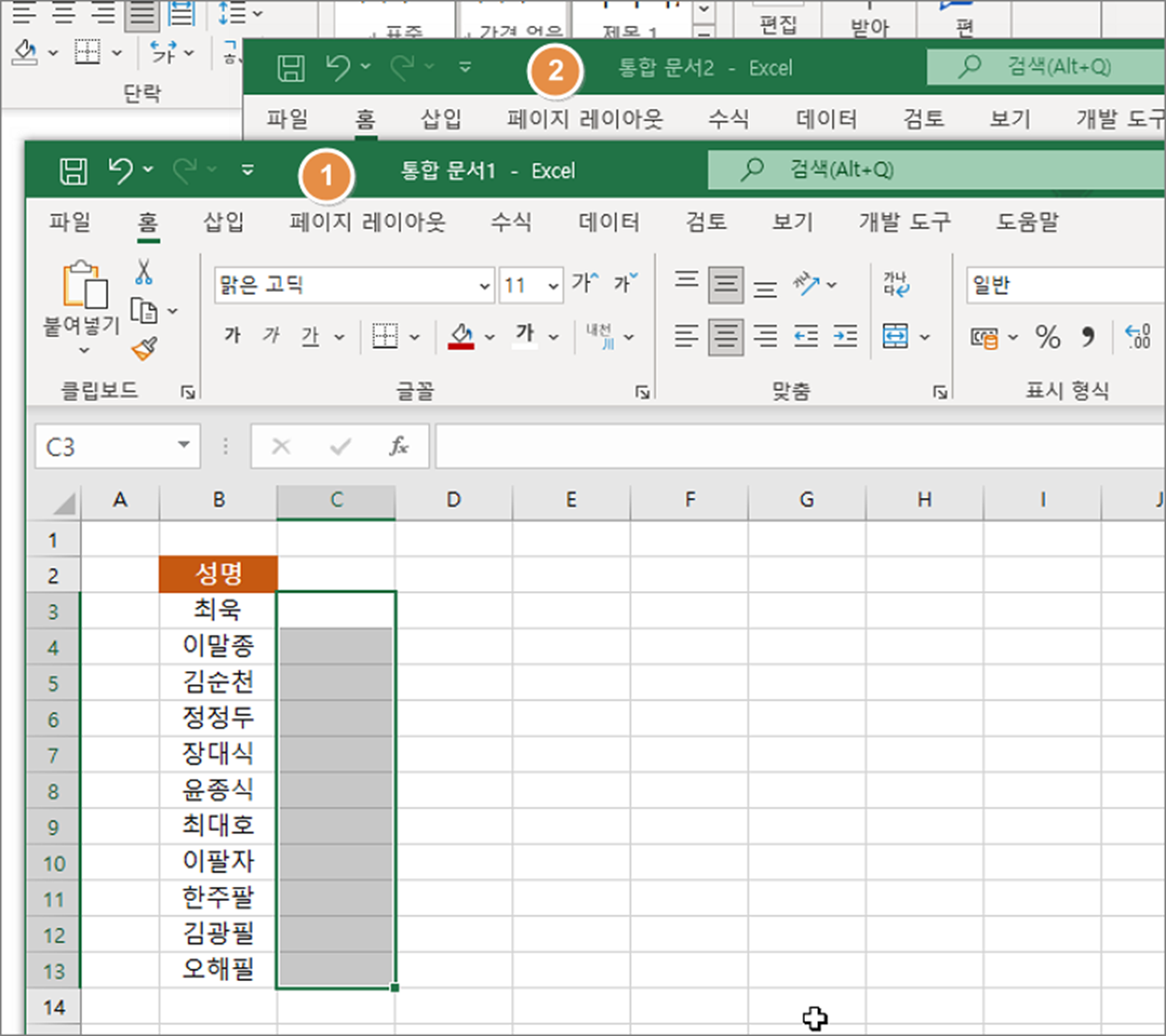 ▼ 그림처럼 두 개의 통합문서가 있다고 합시다. 1번에 있는 데이터를 복사해서 두 번째 통합문서로 옮기는 간단한 방법은 복사 -> 붙여 넣기 입니다.