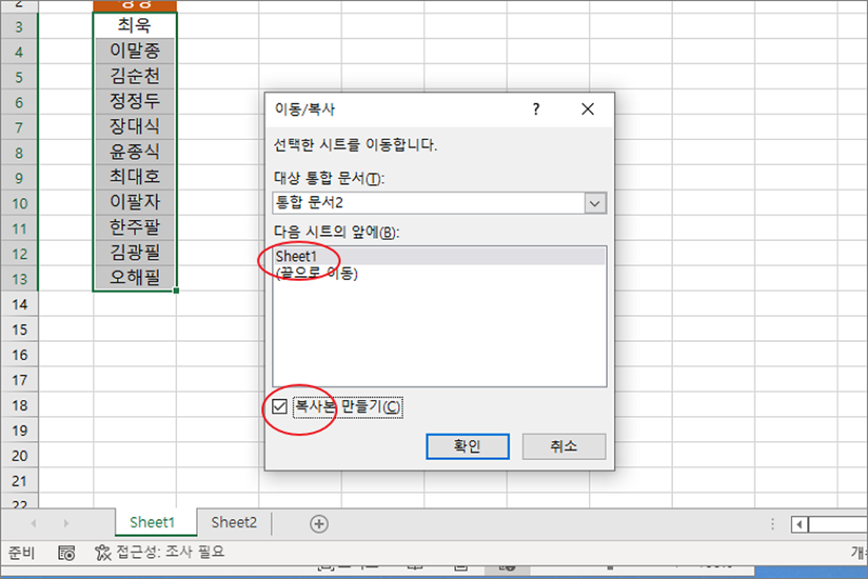 ▼ 다음 바로 아래 시트를 선택하고 아래로 내려와서 복사본 만들기 옵션을 체크합니다. 만약 체크하지 않을 경우 원본 시트에 데이터는 삭제됩니다.