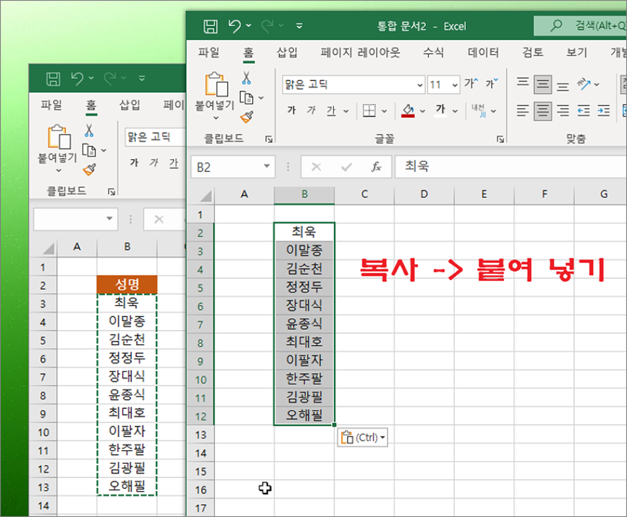 ▼ 1번 통합 문서에서 복사한 후 2번 통합 문서를 열고 원하는 위치에 Ctrl + V 를 눌러 데이터를 붙여 넣습니다. 이전 통합문서에 있던 데이터를 복사한 것입니다.