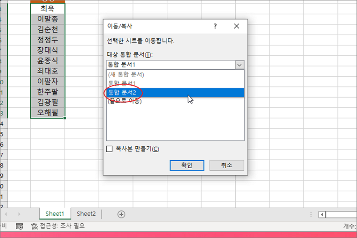 ▼ 이동/복사 창이 뜨면 대상이 되는 통합문서를 목록에서 선택합니다.
