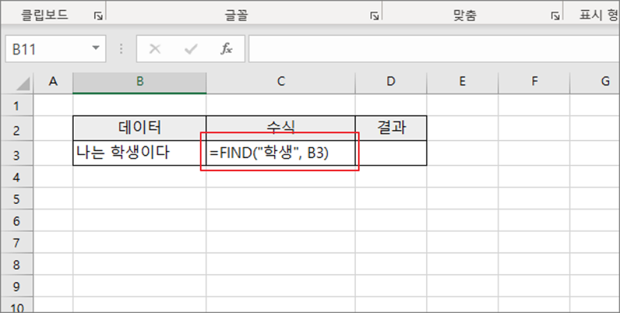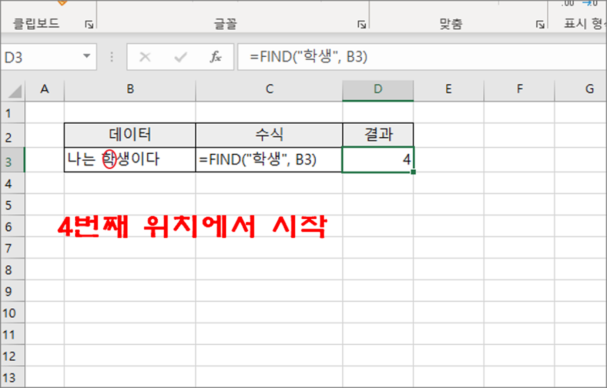 ▼ 아래 샘플은 문자열에서 “학생” 단어가 있는 위치를 찾아 숫자로 반환하는 수식입니다.