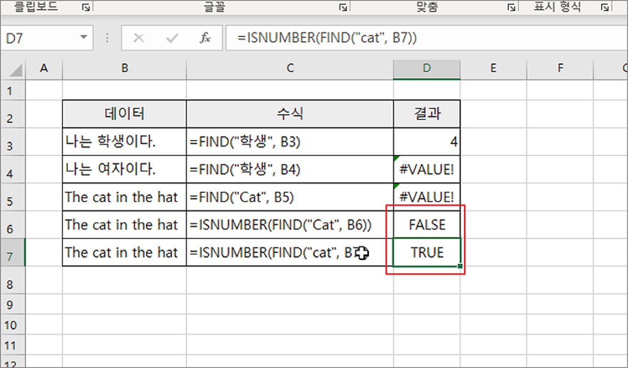 ▼ 만약 검색할 문자열에서 찾는 문장이 존재하는지 여부를 True/False 로 알고 싶다면 ISNUMBER 함수를 이용해 보세요. ISNUMBER 은 숫자인지 아닌지를 판단해서 True/False 중 하나를 반환합니다. FIND 의 결과값이 숫자가 아닌 #VALUE! 라면 ISNUMBER 은 FALSE 를 반환하겠죠.