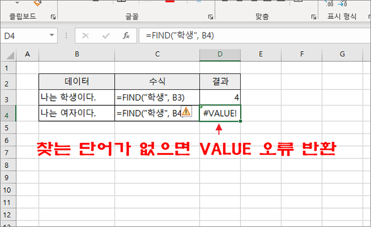 ▼ 만약 문자열에서 찾는 단어가 없으면 숫자가 아닌 #VALUE! 오류를 반환합니다. 우리는 #VALUE! 를 통해서 찾는 단어가 있는지 없는지 판단할 수 있습니다.