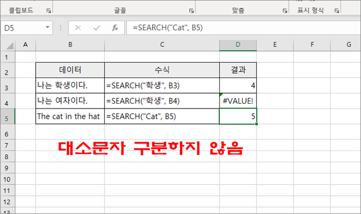 ▼ SEARCH 는 FIND 함수와 달리 영어 알파벳은 대소문자를 구분하지 않습니다. 첫 글자가 대문자인 “Cat” 으로 검색해도 문자열에서 “cat” 위치을 찾아 반환합니다.