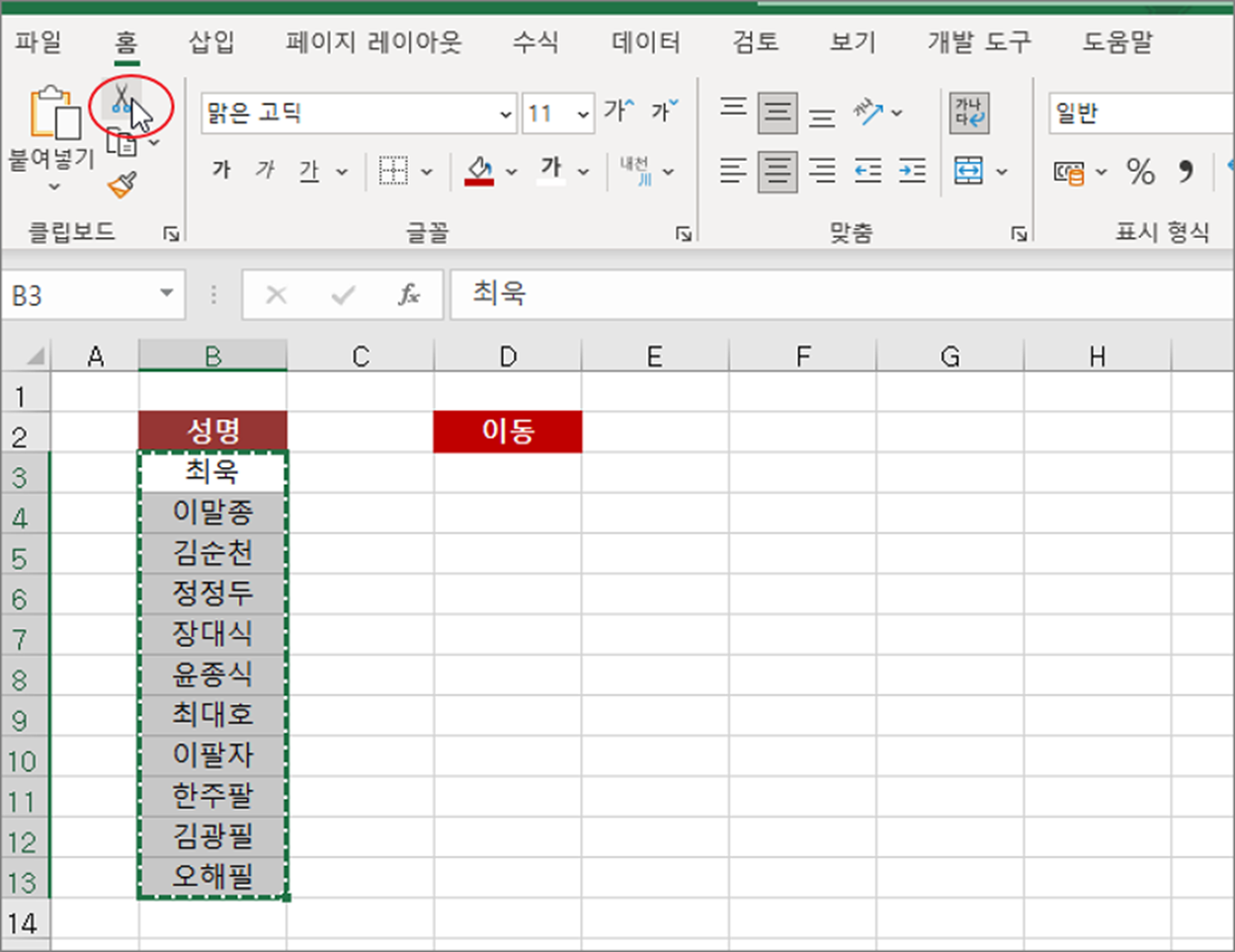 ▼ 리본메뉴의 홈 탭 왼쪽 끝에는 클립보드 그룹이 있습니다. 이곳에는 데이터를 자르고 붙여 넣을 때 사용하는 리본 메뉴가 있습니다. 이동할 데이터가 있는 셀을 선택하고 가위 모양의 홈 탭 > 클립보드 > 잘라내기 를 클릭합니다.