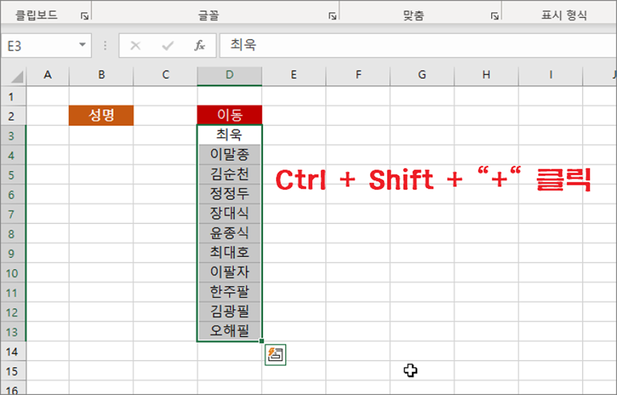 ▼ 그리고 옮길 셀로 이동해서 Ctrl + Shift + “+” 를 클릭합니다.