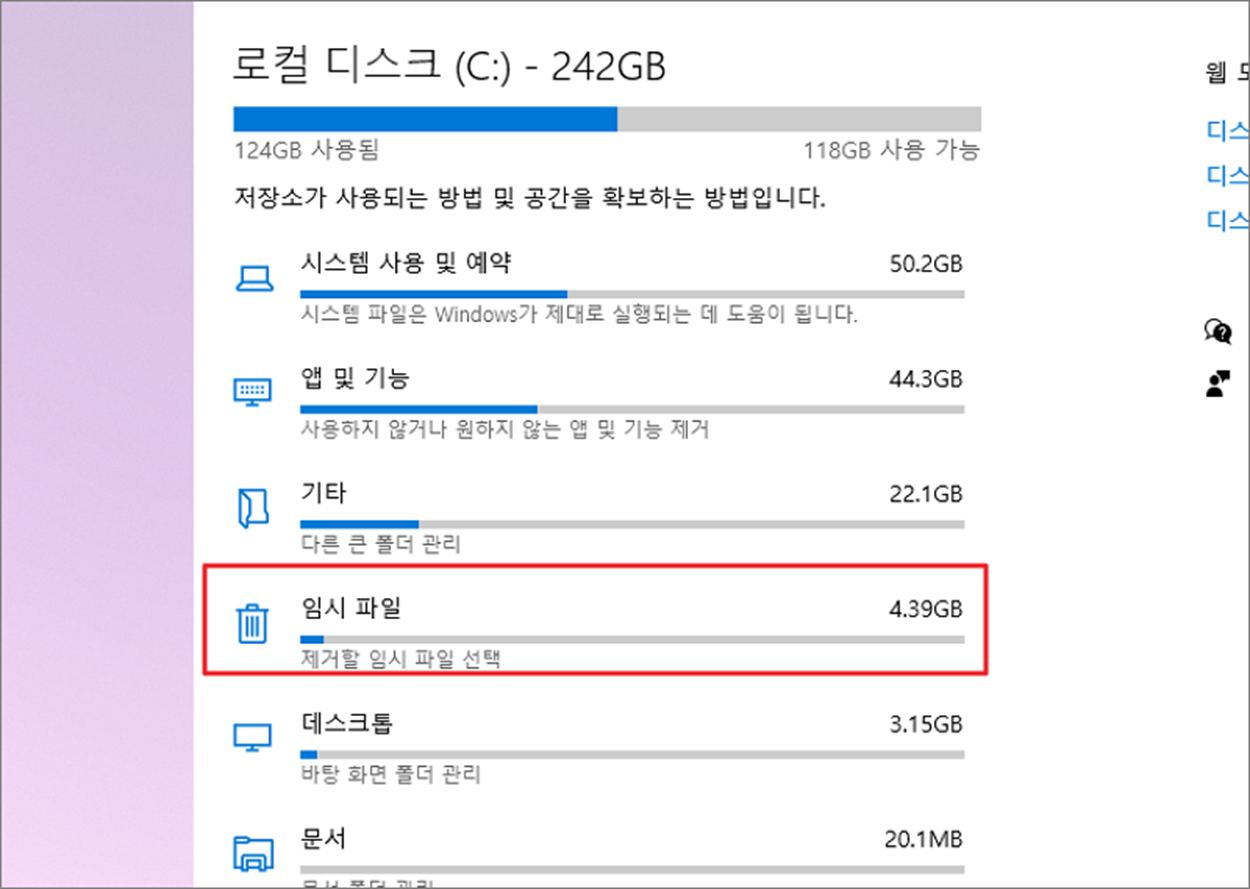 ▼ 오른쪽 화면에서 로컬 디스크에 항목별로 차지하는 크기를 볼 수 있습니다. 그 중에서 임시 파일을 클릭합니다.