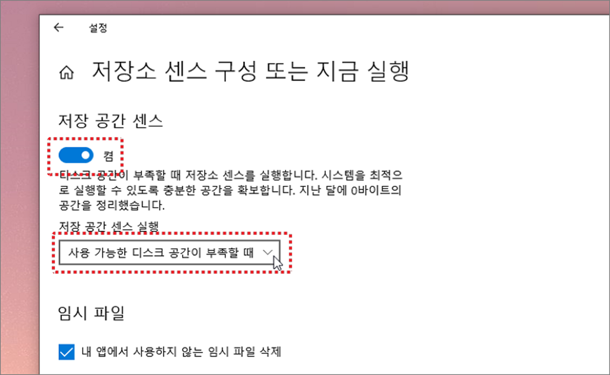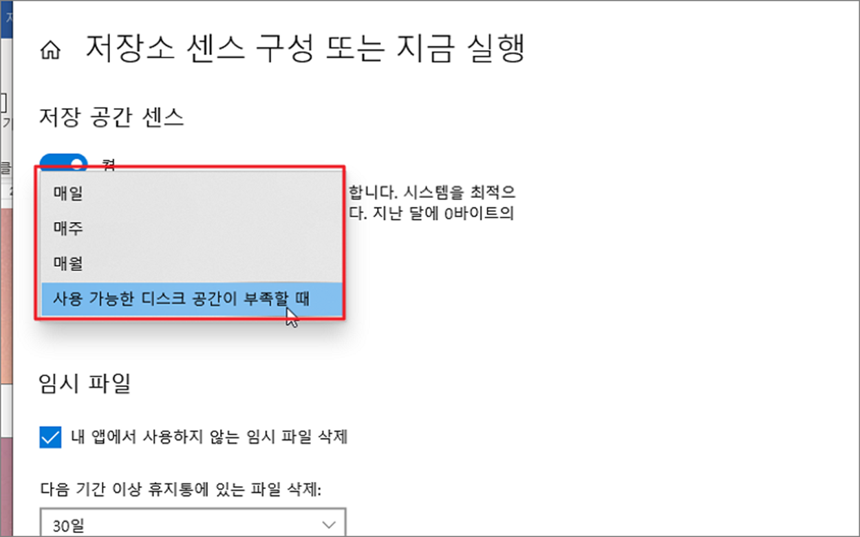 ▼ “저장소 센스 구성 또는 지금 실행” 제일 상단에 “저장 공간 센스” 를 켭니다. 그리고 아래 저장 공간 센스 실행 콤보박스를 클릭해서 옵션을 선택합니다.