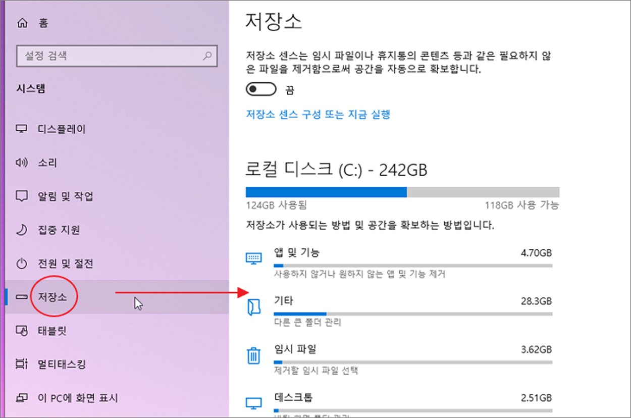 ▼ 다음은 시스템 > 저장소 메뉴를 선택합니다. 그리고 오른쪽 화면으로 이동합니다.