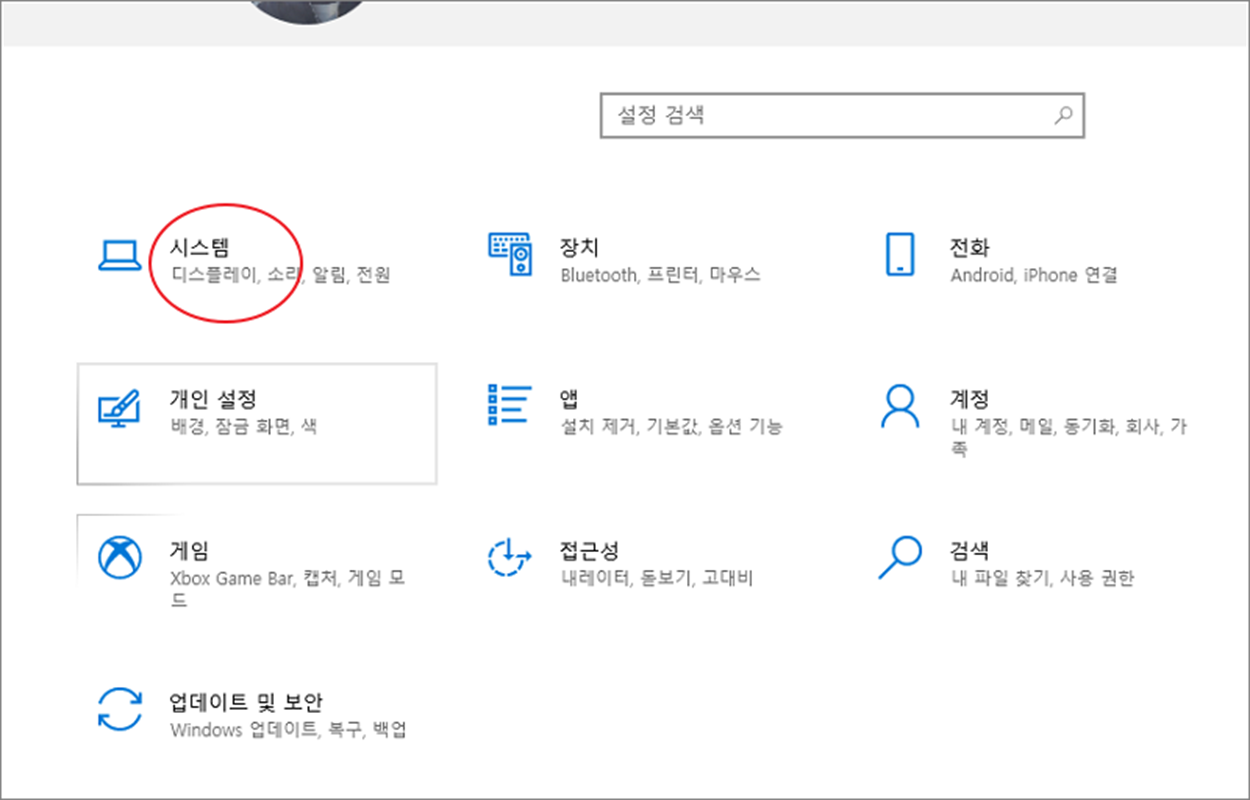 ▼ 먼저 공간 확보를 위해 수동으로 임시 파일을 삭제해 보겠습니다. 설정 > 시스템 메뉴를 클릭합니다.