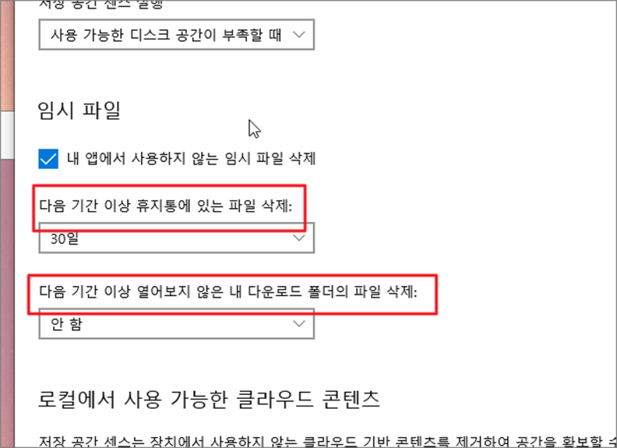 ▼ 바로 아래 임시 파일 항목에서는 휴지통과 다운로드 폴더의 자동 삭제를 설정할 수 있습니다.