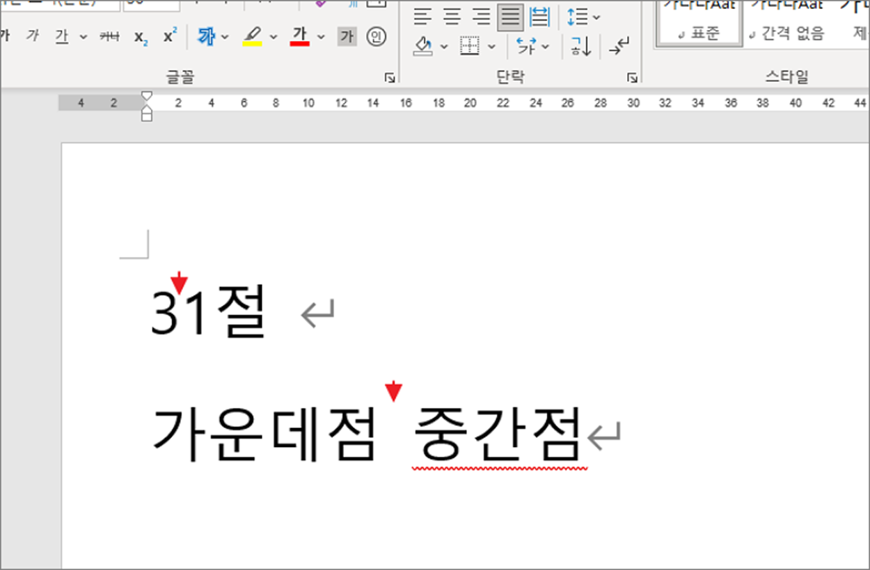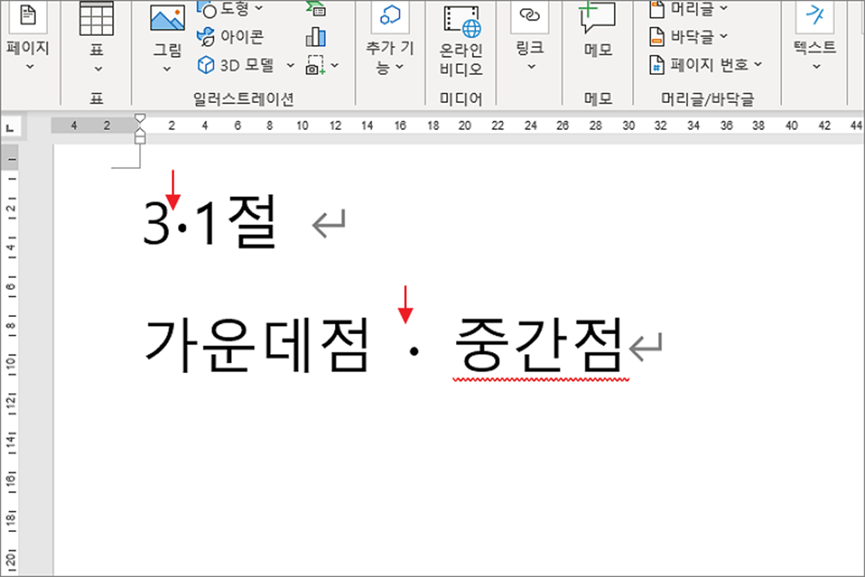▼ 결과는 다음과 같습니다. 워드에서는 가운데점으로 사용하는 기호는 단 하나입니다. 한컴오피스처럼 다양한 형태의 가운데점은 제공하지 않습니다.