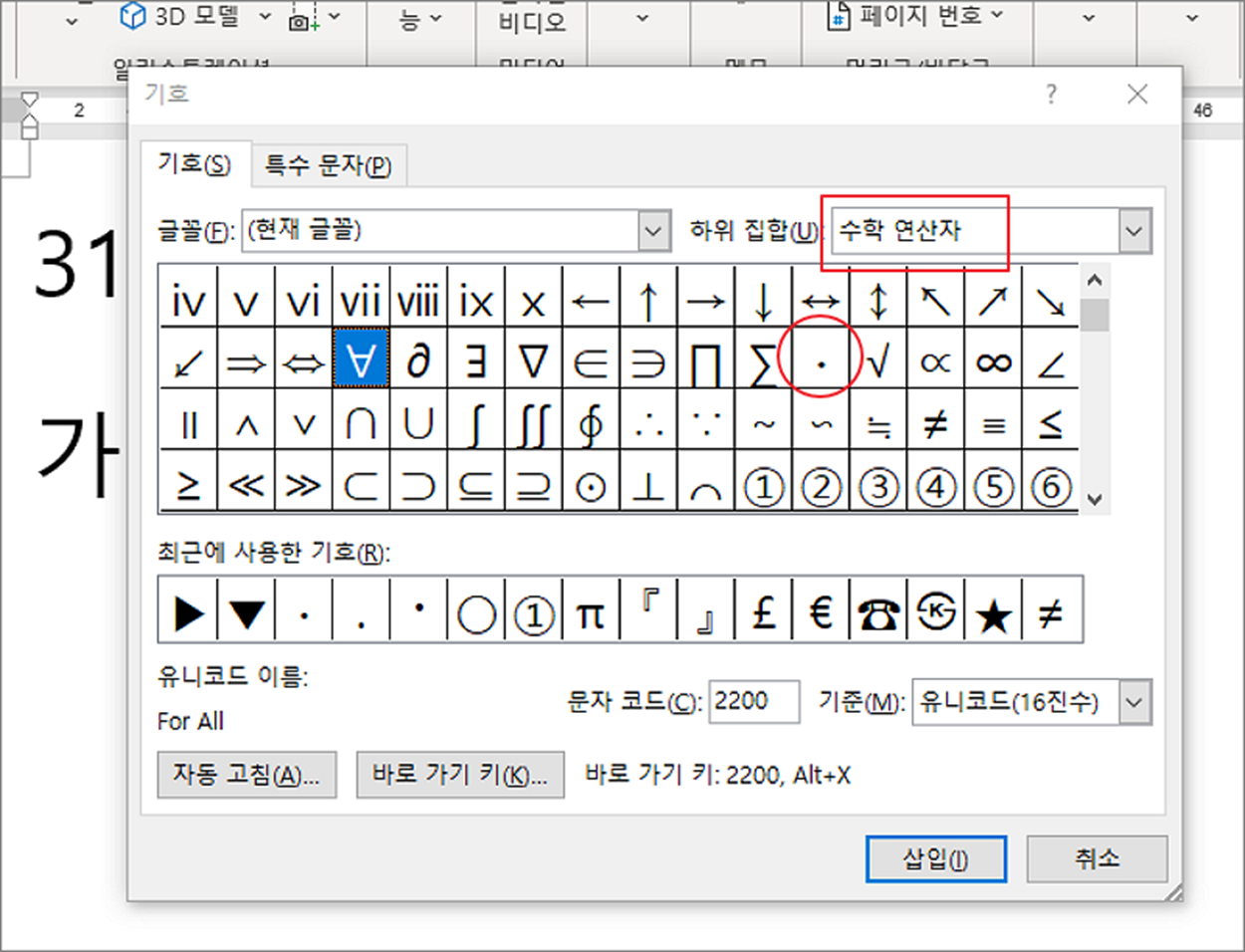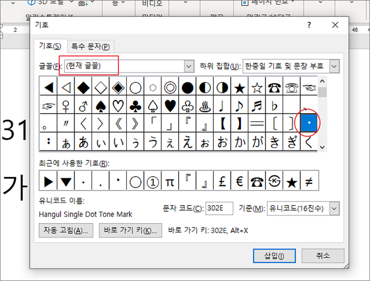 ▼ 기호 대화상자에서 글꼴을 현재 글꼴로 선택하고 가운데점을 찾습니다. 오른쪽에 가운데점이 보이시죠.
