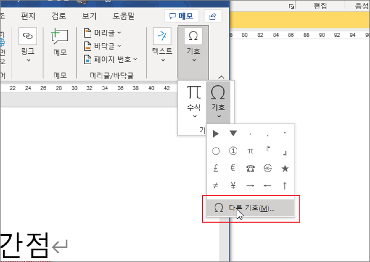 ▼ 기호 리본 메뉴 하위에는 이전에 사용한 적이 있는 특수문자 목록과 다른 기호 메뉴가 있습니다. 가운데점을 찾기 위해 다른 기호 메뉴를 클릭합니다.
