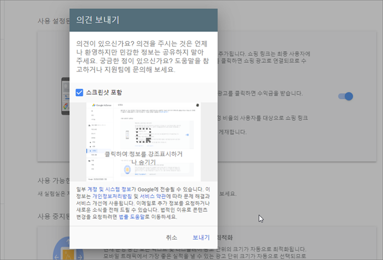 ▼ 광고를 사용하다가 자신만의 의견이나 문제점이 발견된다면 화면을 캡처해서 고객지원팀에 보낼 수도 있습니다. 저는 설정한지 1주일 정도 되었습니다. 유의미한 결과가 나오려면 한달 정도는 테스트해 봐야 할 것 같습니다. 그리고 해당 광고는 현재 실험이기 때문에 사라질 수도 있습니다. 효과가 좋아서 수익이 조금이라도 올랐으면 좋겠네요. 앞으로 기대해 보겠습니다.