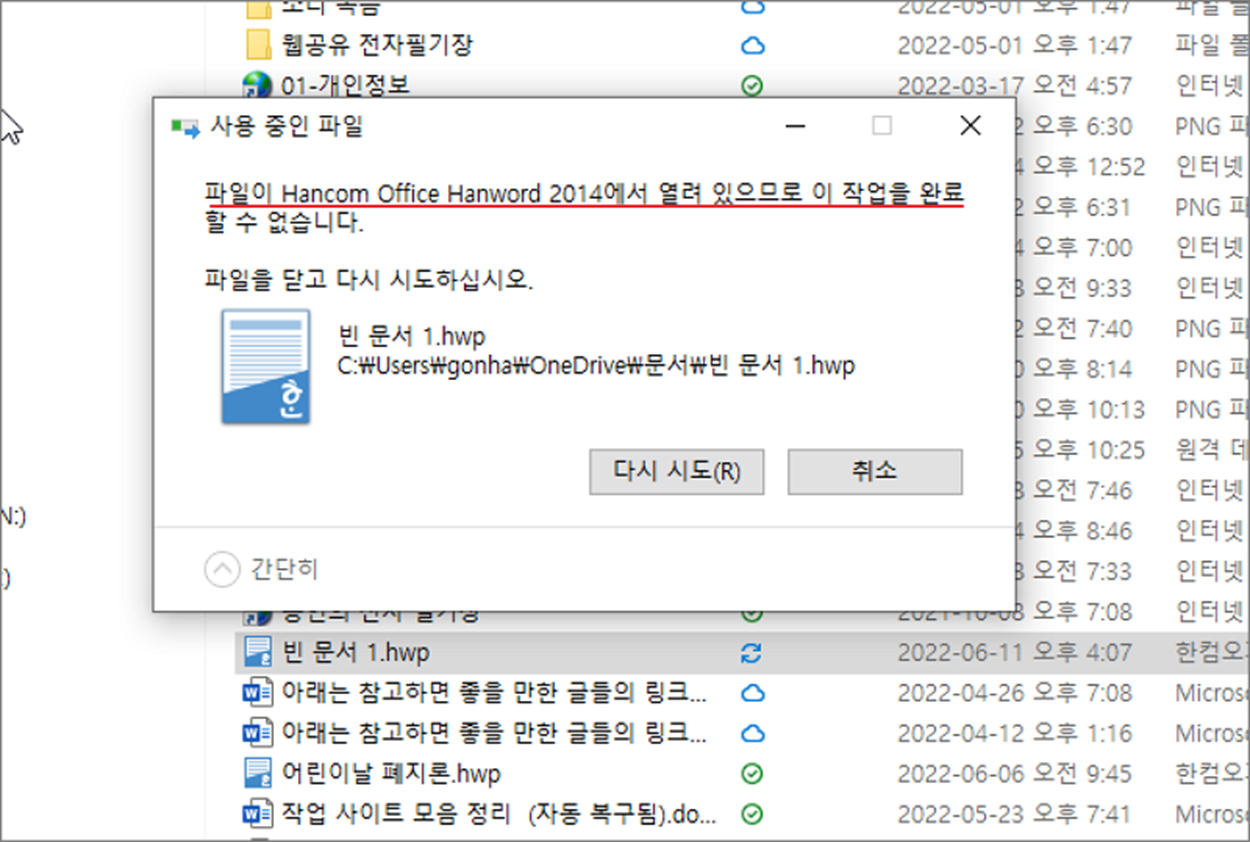 ▼ 다음은 파일 삭제입니다. 과정은 동일합니다. 그림처럼 파일 삭제 오류가 뜬다면 리소스 모니터를 띄웁니다.