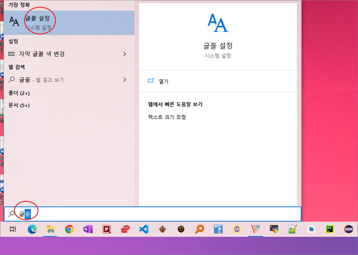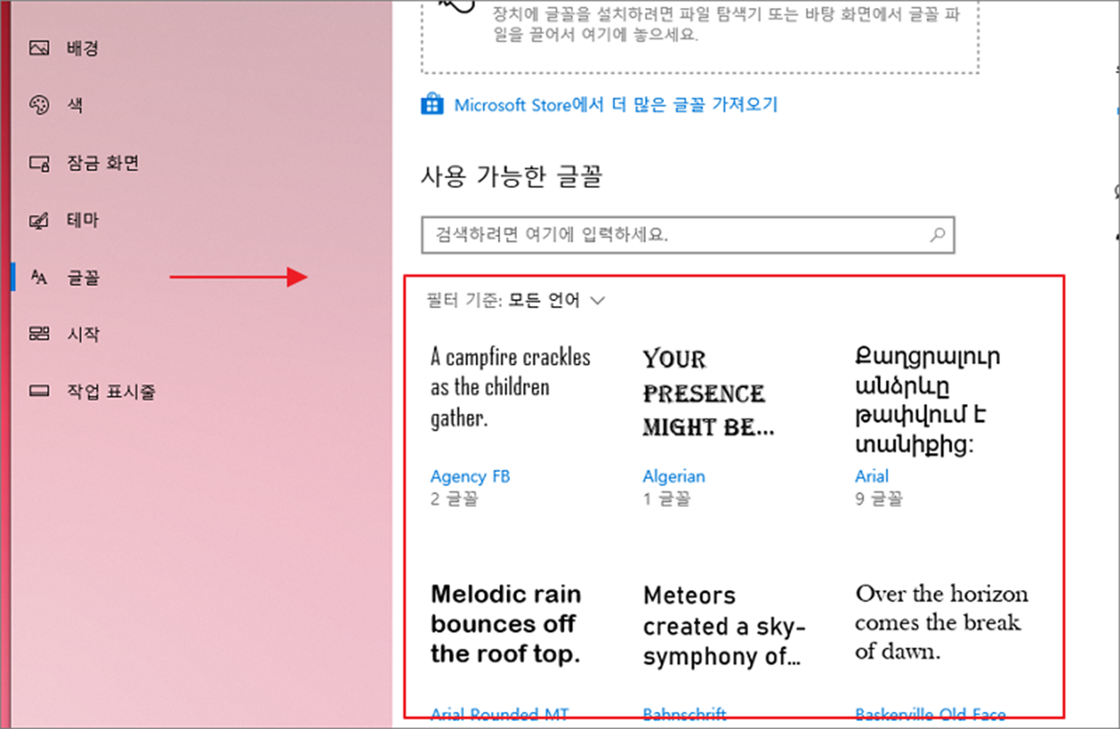 ▼ 먼저 윈도우에 설치된 전체 폰트를 볼 수 있는 설정화면으로 이동하겠습니다. 이곳에서 어떤 폰트가 설치되어 있는지 검색으로 확인할 수 있습니다. 검색에서 글꼴 을 입력하고 결과 목록에서 글꼴 설정을 클릭합니다.
