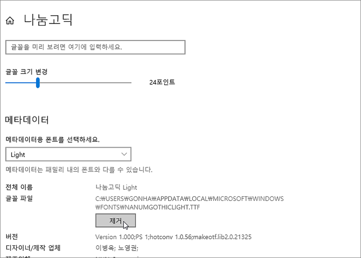 ▼ 글꼴 상세 화면으로 이동해서 제거 버튼을 클릭합니다. 만약 여러 개의 글꼴이라면 동일한 화면에서 모두 삭제할 때까지 제거 버튼을 눌러 줍니다.