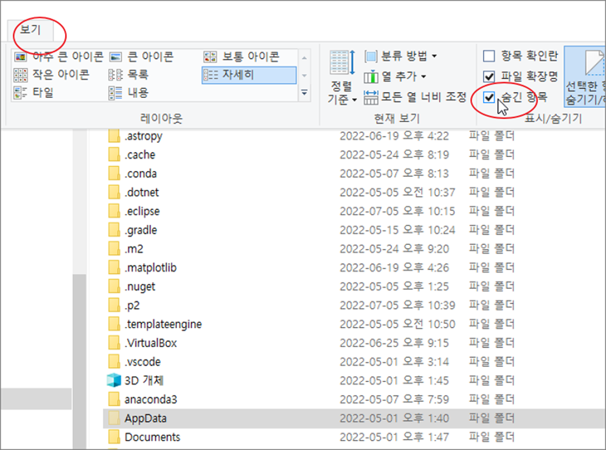 ▼ AppData 폴더가 보이지 않는다면 보기 옵션을 변경해야 합니다. 보기 > 숨긴 항목 옵션을 체크합니다.