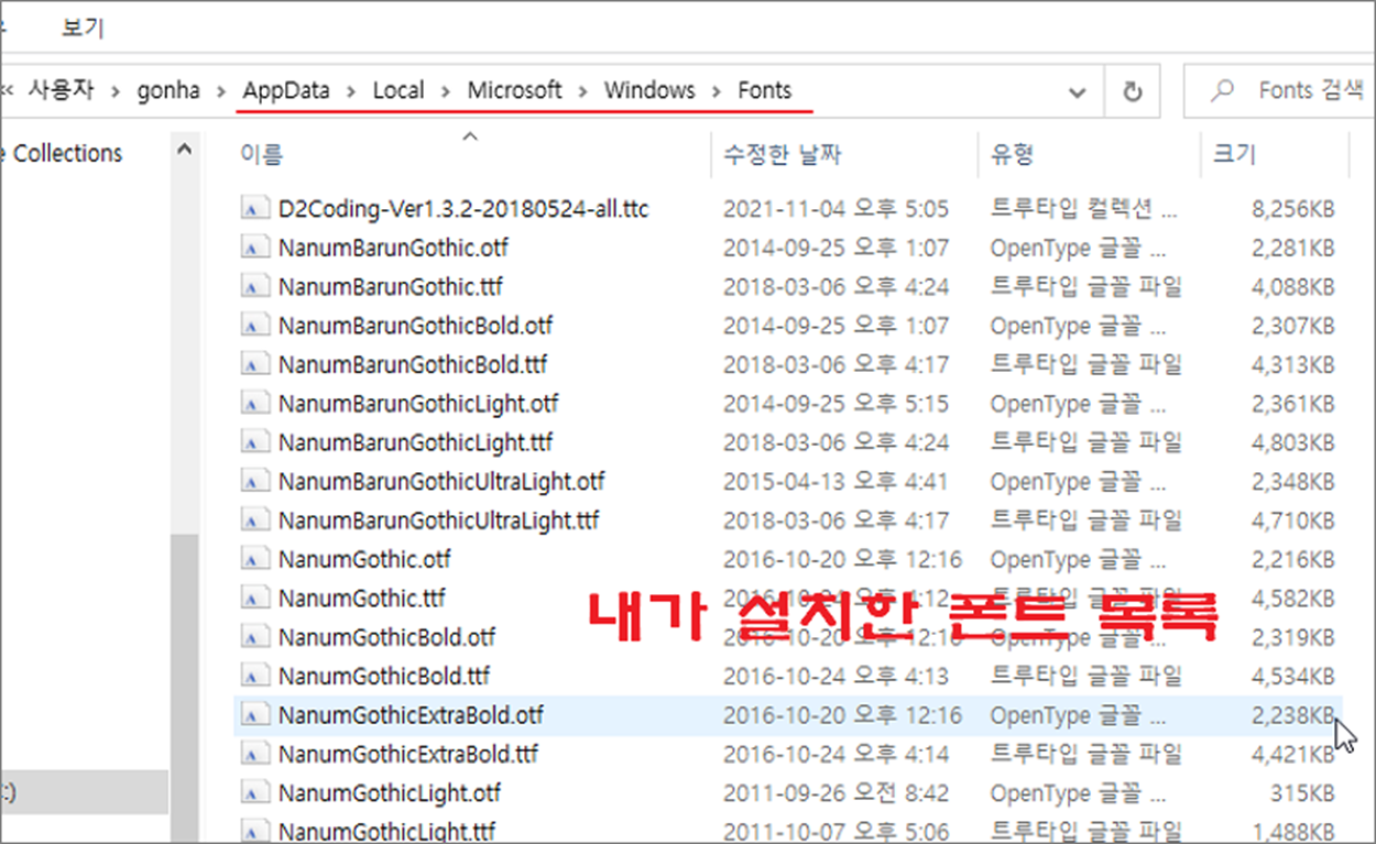▼ 여기에서는 지금까지 시스템 기본 폰트를 제외한 사용자가 직접 설치한 것들을 모두 볼 수 있습니다. 만약 컴퓨터 포맷으로 폰트 백업이 필요한 경우 해당 폴더로 와서 모두 복사한 후 따로 보관합니다.