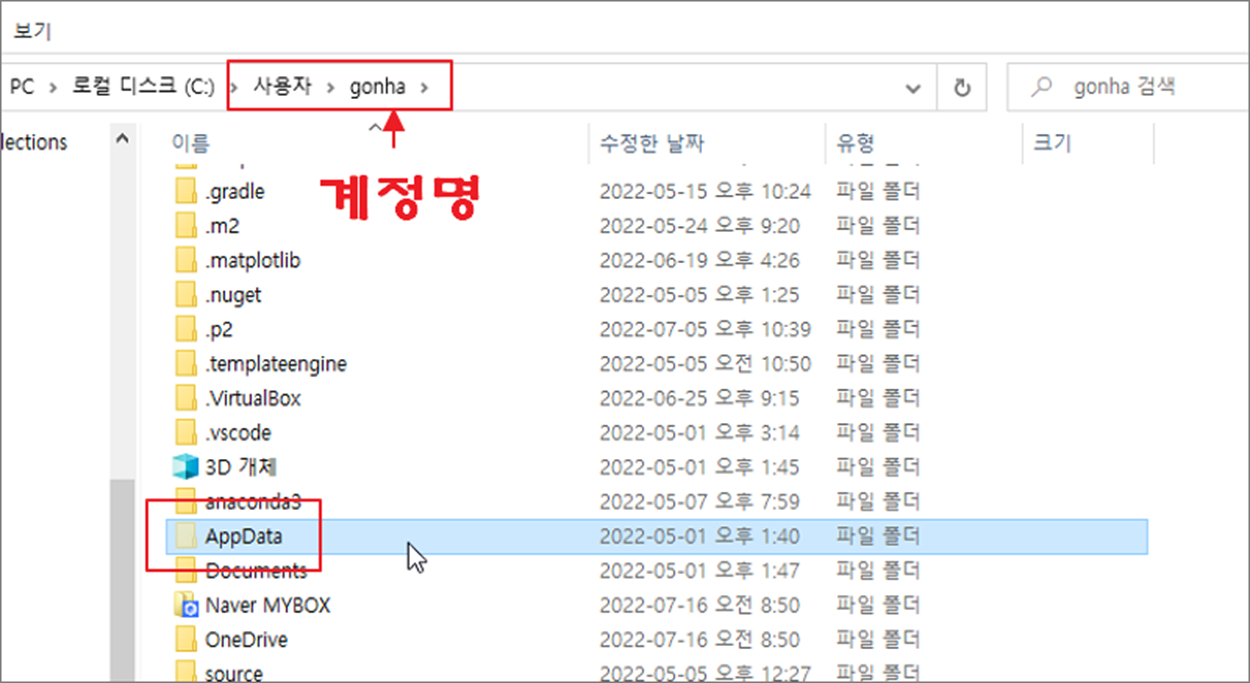 ▼ 윈도우는 설치와 동시에 기본 내장 폰트를 설치합니다. 만약 사용자가 필요한 폰트가 없는 경우 다운받아 설치합니다. 이렇게 사용자가 직접 설치한 폰트인지? 아니면 기본 내장 폰트인지 어떻게 구분할 수 있을 까요? 윈도우 “사용자” 폴더에는 사용자가 직접 추가한 폰트를 관리하는 폴더가 있습니다. 사용자 > 계정명 > AppData 폴더로 이동합니다.