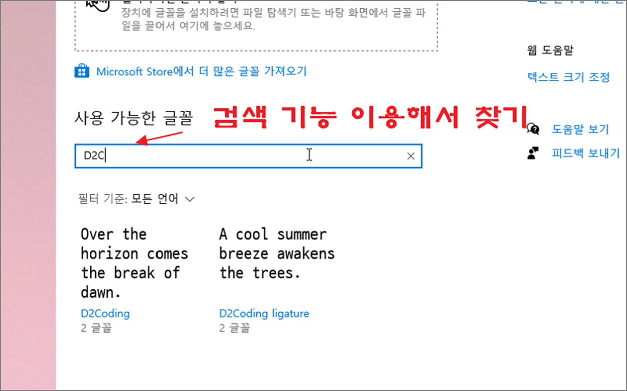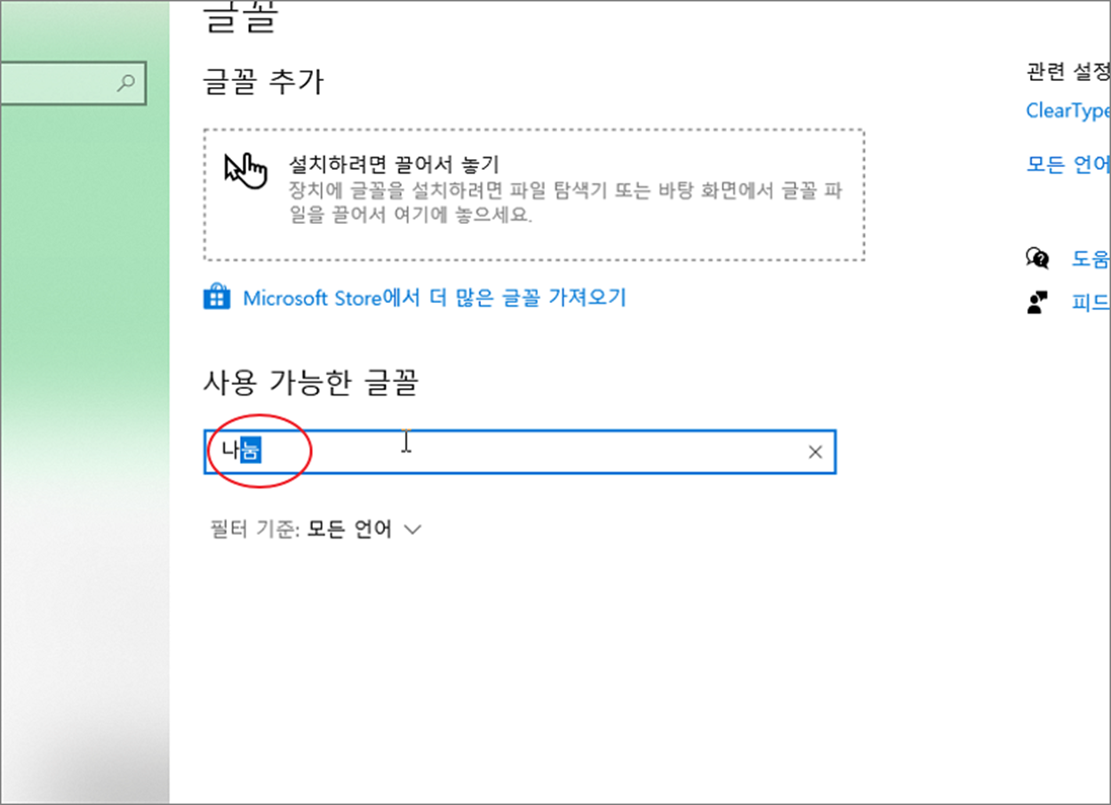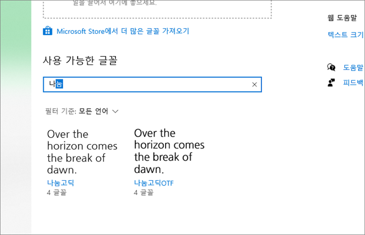 ▼ 만약 자신이 찾는 글꼴이 없다면 다운받아 설치합니다. 저는 나눔 글꼴이 필요한데 검색해 보니 안보이네요. 설치를 진행해 보겠습니다.