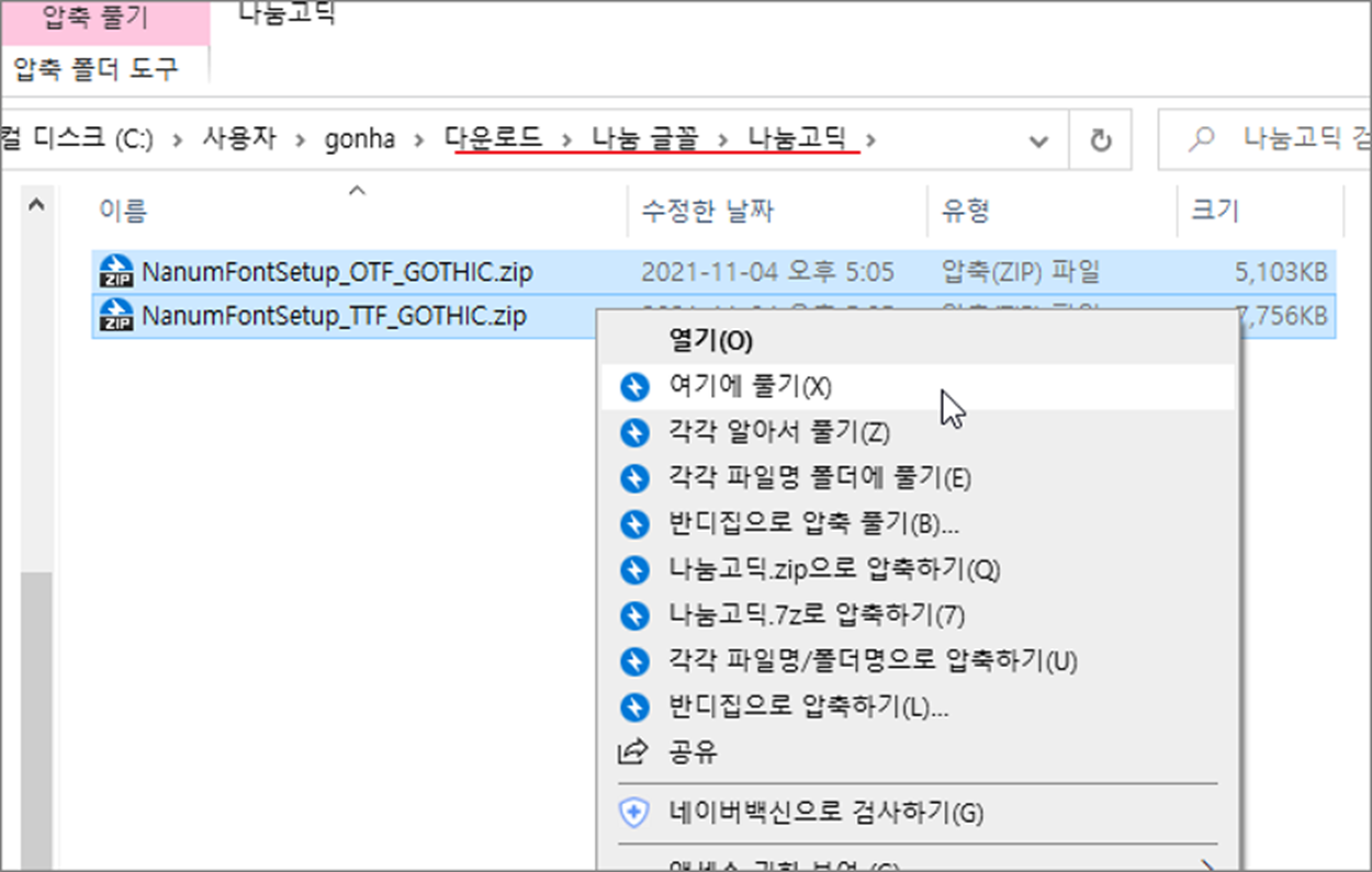 ▼ 압축을 풀고 설치하고 싶은 글꼴 폴더로 갑니다. 그리고 해당 폴더의 파일도 압축을 모두 해제합니다.