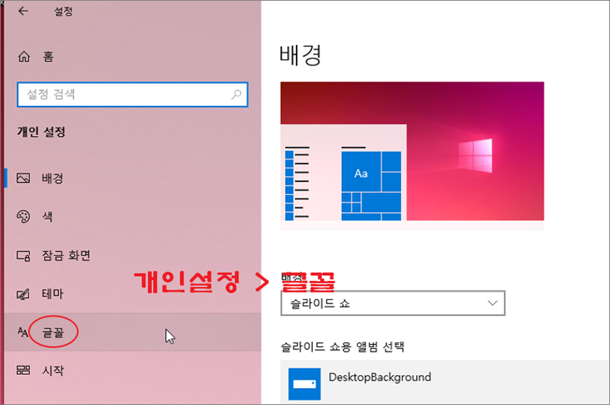▼ 윈도우 설정 화면에서 이동하고 싶다면 설정 > 개인설정 > 글꼴 메뉴를 차례대로 클릭합니다.