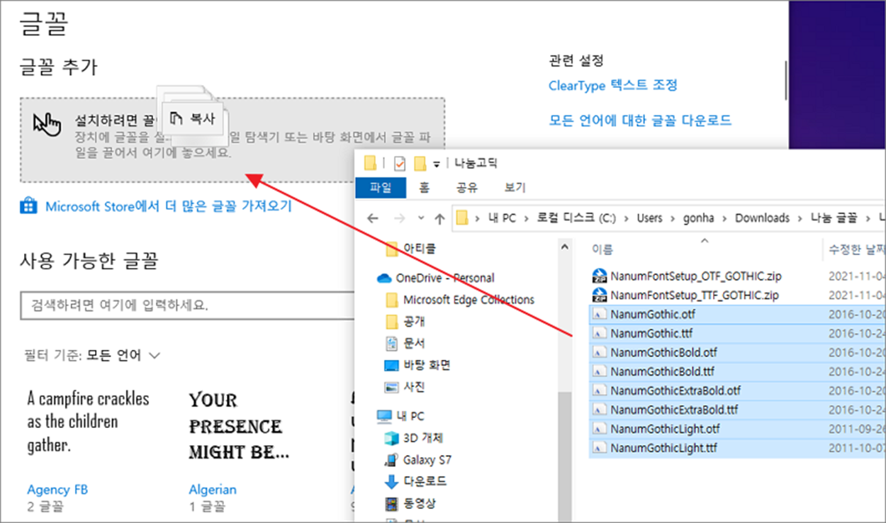 ▼ 설치할 글꼴을 모드 선택한 뒤 끌어서 글꼴 설정 화면 상단 글꼴 추가 란에 놓습니다. 더 간단한 방법은 글꼴을 모두 선택하고 오른쪽 마우스 > 설치 메뉴를 클릭하는 것입니다.