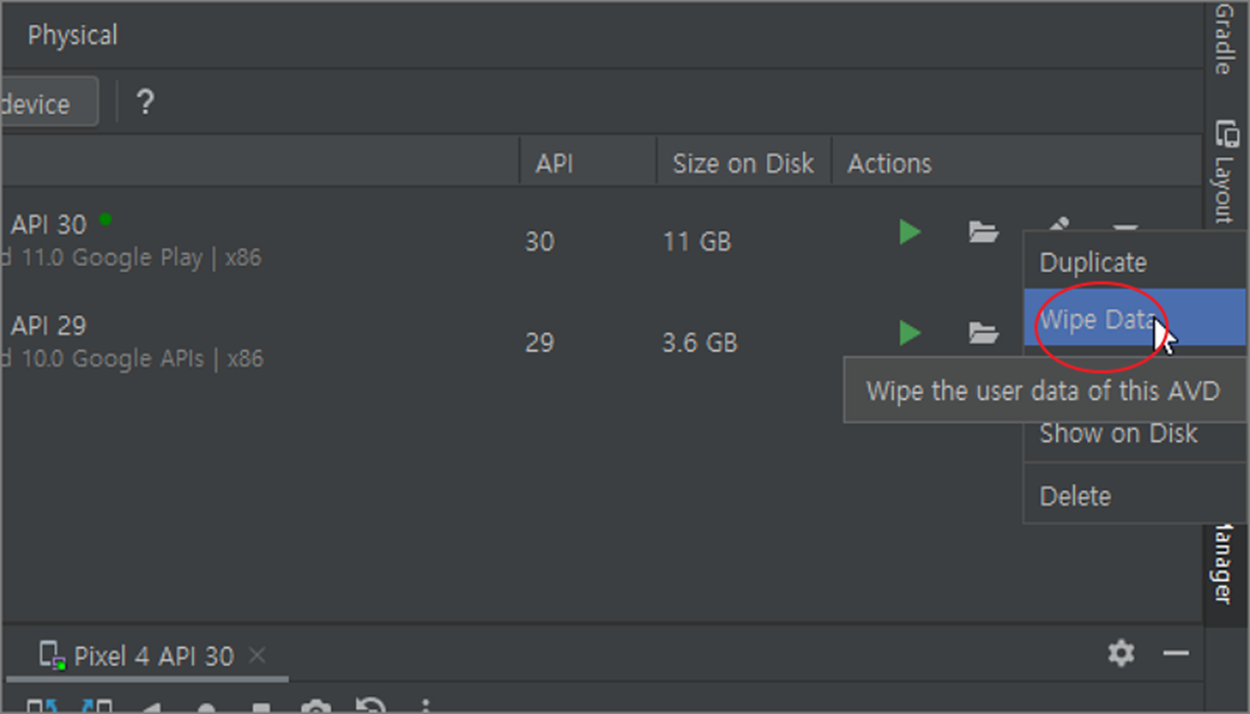 ▼ 화살표 > Wipe Data 메뉴를 클릭해서 에뮬레이터를 초기화합니다. 지금까지 사용하면서 늘어난 데이터 모두를 삭제합니다.