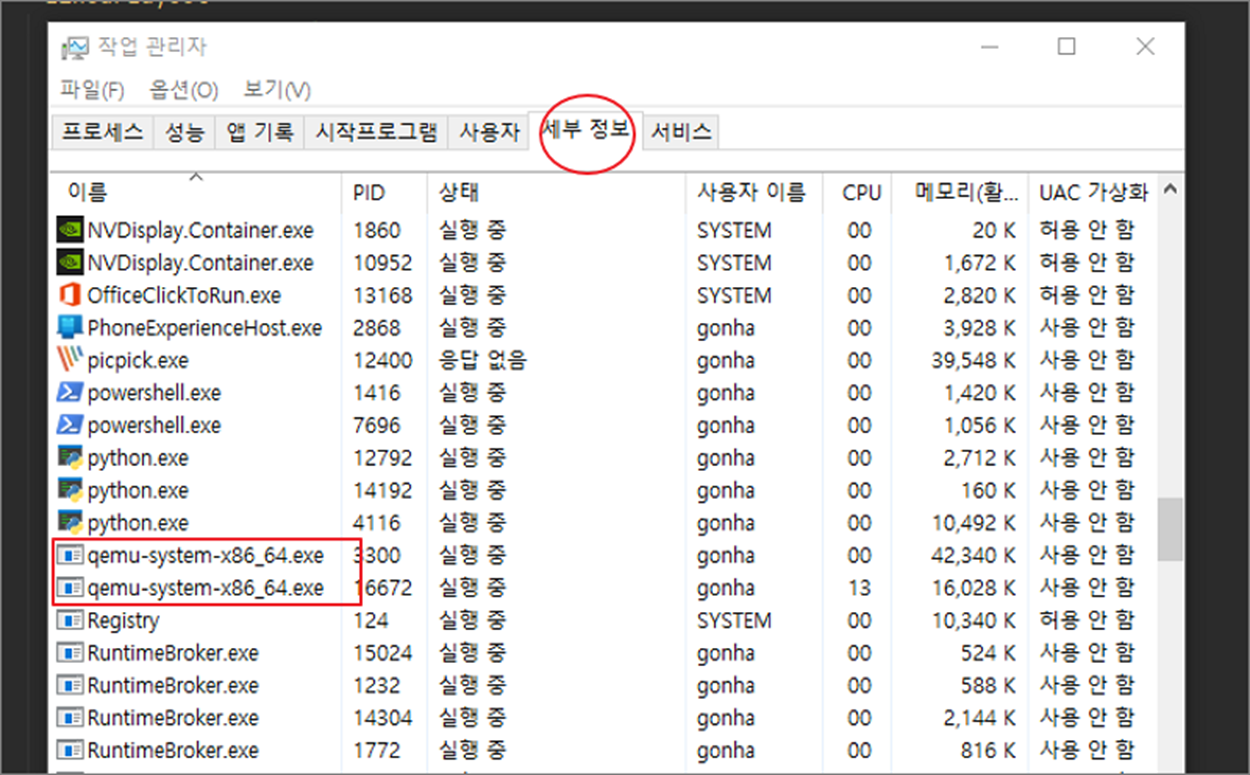 ▼ 작업 표시줄 > 오른쪽 마우스 > 작업 관리자를 띄웁니다. 그리고 세부 정보 탭으로 가서 qemu-system-x86_64.exe 를 찾습니다. 에뮬레이터를 시작하면 실행되는 exe 프로그램입니다. 이름은 조금 다를 수 있습니다.