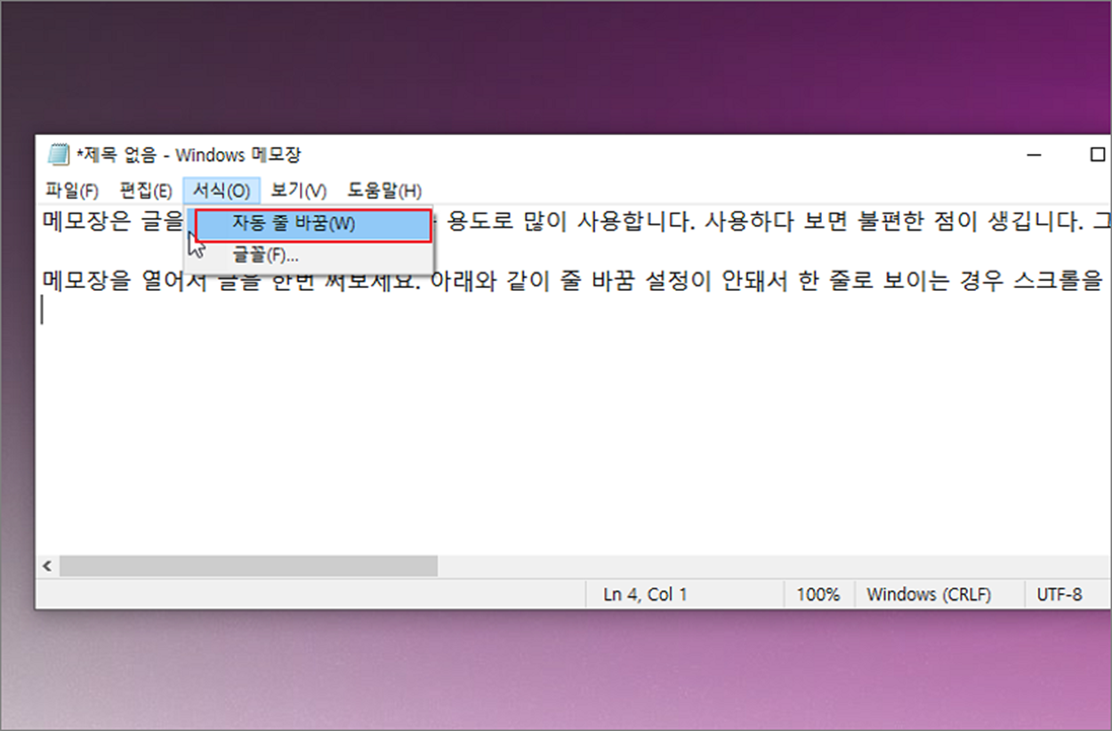 메모장은 글을 간단하게 쓰고 보관하는 용도로 많이 사용합니다. 사용하다 보면 불편한 점이 생깁니다. 그 중 하나가 줄바꿈이 안되는 문제입니다. 기본 설정이 한 줄이라 화면의 크기에 맞게 자동으로 줄 바꿈해서 보고 싶다면 설정을 변경해 줘야 합니다. 간단하지만 모르면 헤매는 설정이므로 기억해 두시기 바랍니다.