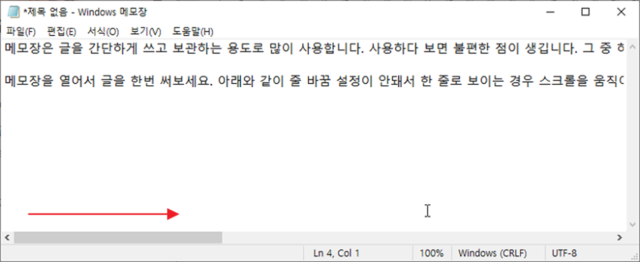▼ 메모장을 열어서 글을 한번 써보세요. 아래와 같이 줄 바꿈 설정이 안돼서 한 줄로 보이는 경우 스크롤을 움직여야 가려진 글들을 볼 수 있습니다. 아주 불편한 상황입니다.