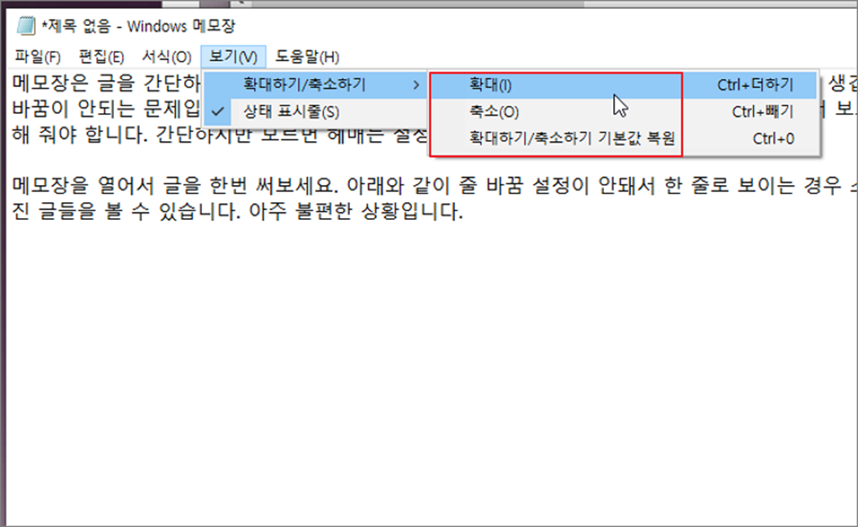 ▼ 여기에 더해서 글이 잘 안보이는 경우 글꼴 변경없이 확대/축소를 통해 글자를 확대할 수 있습니다. 간단하게 단축키를 통해서 조절이 가능합니다. 보기 > 확대하기/축소하기 > 확대/축소 를 눌러 글자를 키우거나 줄일 수 있습니다. 단축키는 메뉴 옆에 나와 있듯이 Ctrl + “+” 와 Ctrl + “-” 입니다.