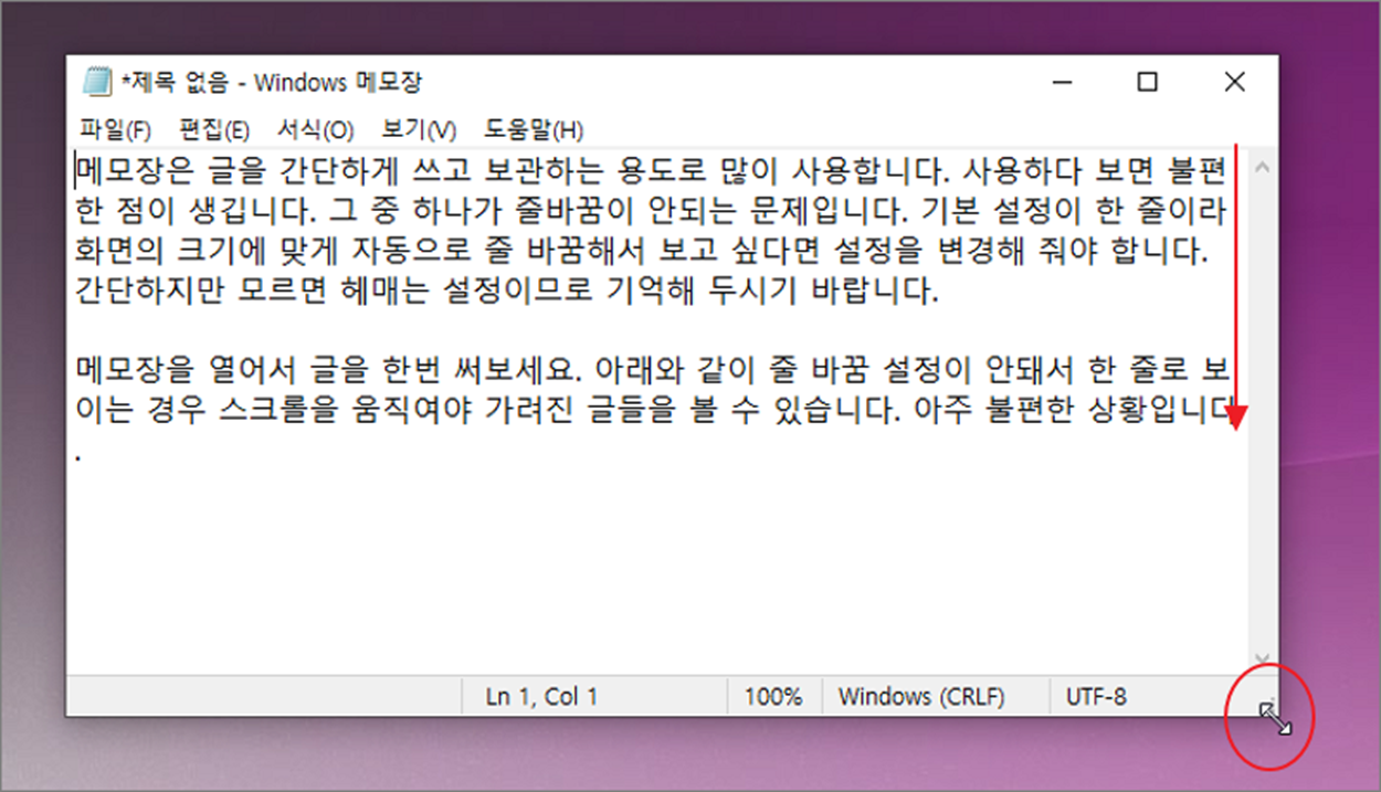 ▼ 메모장 하단에 스크롤이 사라진 걸 볼 있습니다. 편집 화면을 줄이거나 늘여보세요. 줄 바꿈이 자동으로 이루어 집니다.