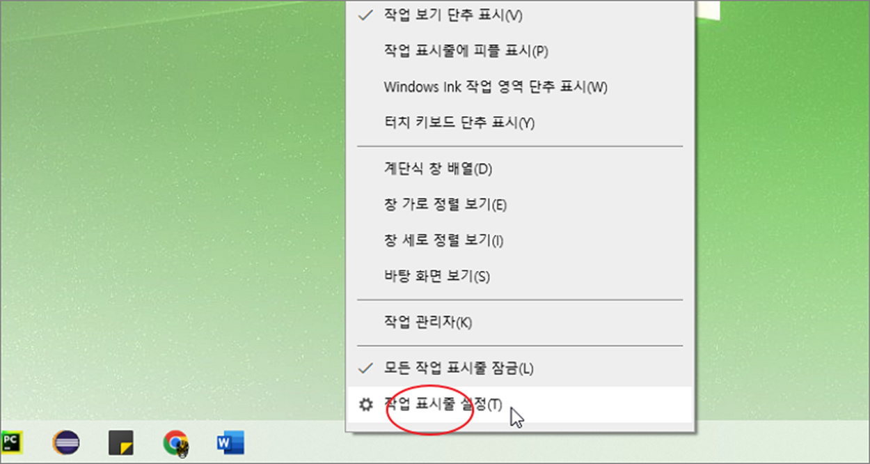 ▼ 이런 그룹화된 아이콘이 불편한 경우 해제할 수도 있습니다. 작업 표시줄에서 오른쪽 마우스 > 작업 표시줄 설정 메뉴를 클릭합니다.