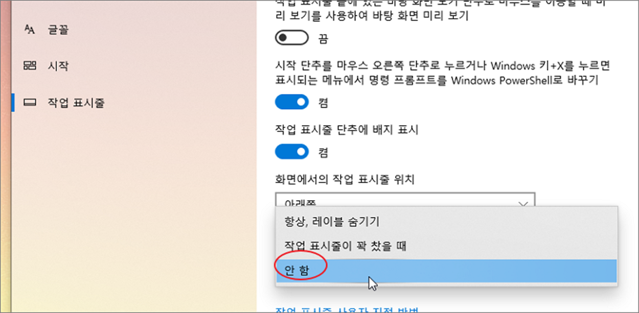 ▼ 다시 작업표시줄 설정으로 가서 세 번째 옵션인 안 함을 선택해 보겠습니다.