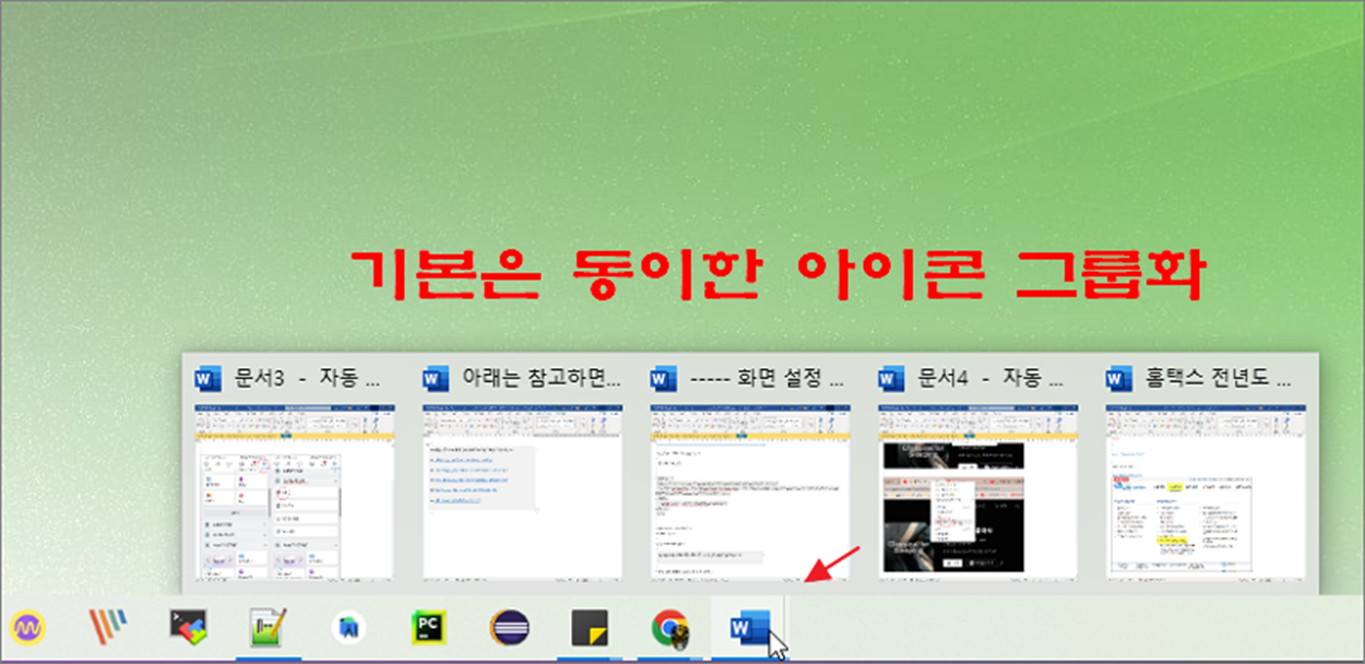 ▼ 그림처럼 실행한 워드창이 여러 개 인 경우 작업 표시줄에 하나로 표시가 됩니다. 마우스를 아이콘에 올리면 내용인지 화면을 축소해서 보여줍니다.