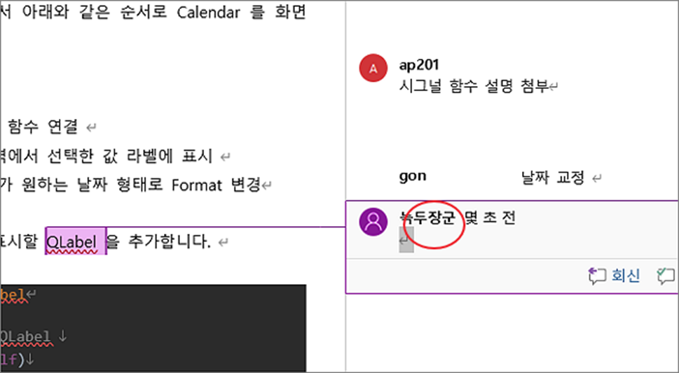 ▼ 메모는 오른쪽 여백에 박스로 나타납니다. 그리고 메모 박스와 빨간색 라인으로 연결되어 있습니다.