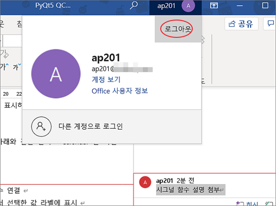 ▼ 현재 계정을 로그아웃 해 보겠습니다. 상단 아이디를 클릭하고 계정 정보 창이 나오면 로그아웃 버튼을 클릭합니다.
